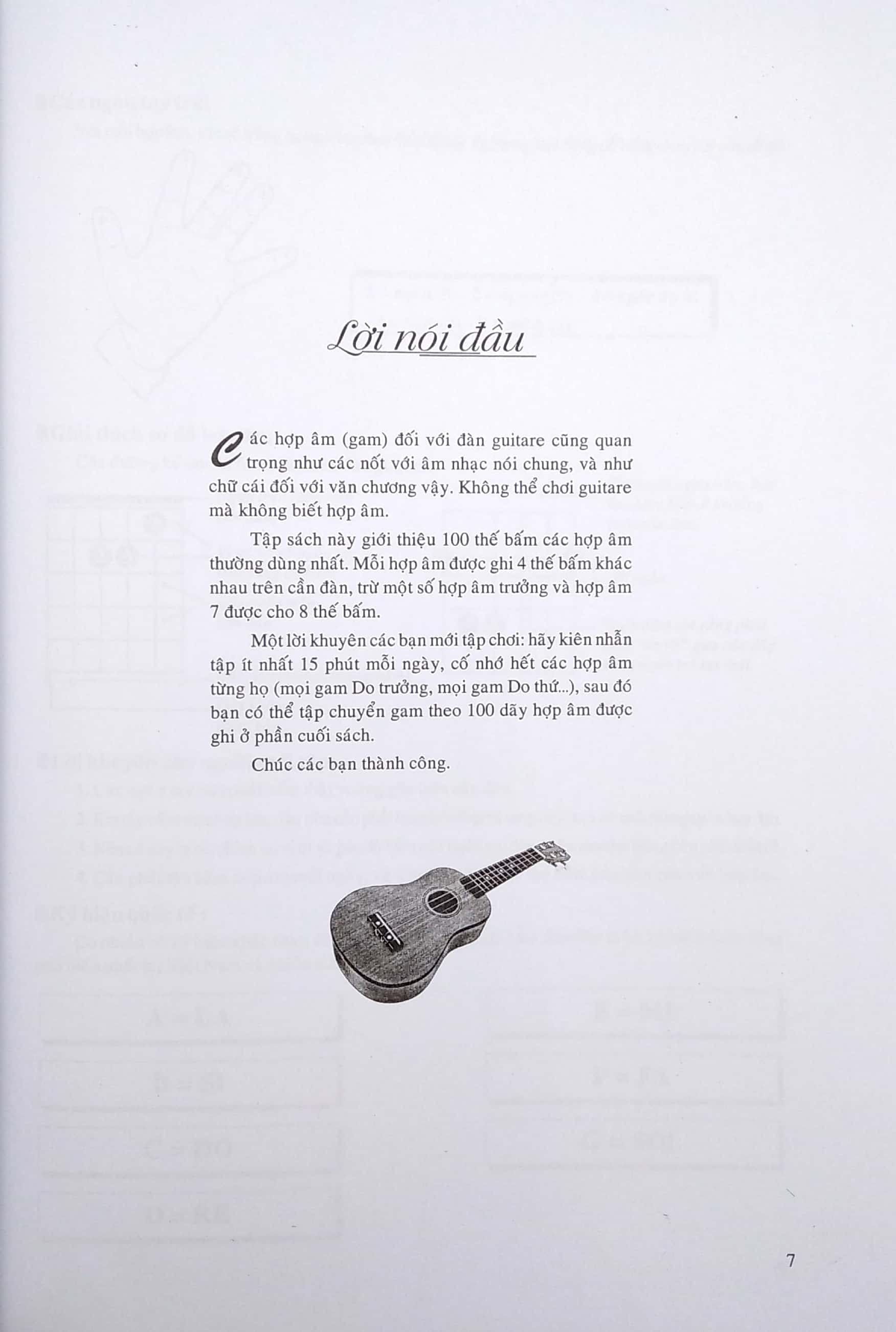 Sách giới thiệu 100 thế bấm các hợp âm thường dùng nhất. Mỗi hợp âm được ghi 4 thế bấm khác nhau trên cần đàn, trừ một số hợp âm trưởng và hợp âm 7 được cho 8 thế bấm.