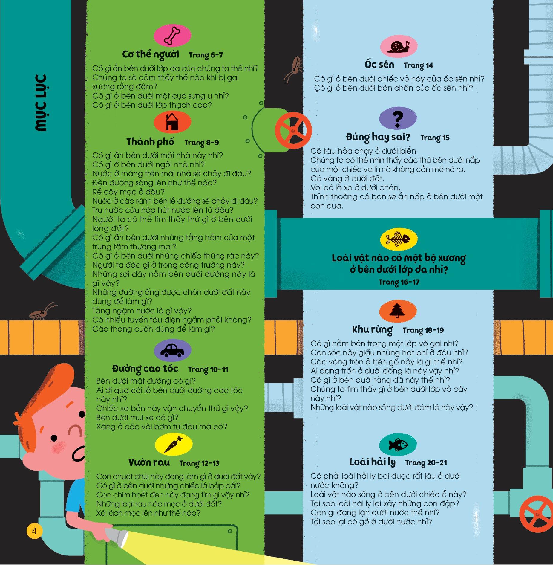 Cuốn sách bìa cứng cực đẹp, dày tới 36 trang, tổng hợp 16 chủ điểm hấp dẫn như: thành phố, đường cao tốc, vườn rau, hang động ngầm, lăng mộ, trang phục… sẽ đưa trẻ khám phá thế giới kiến thức vô cùng đa dạng và phong phú.