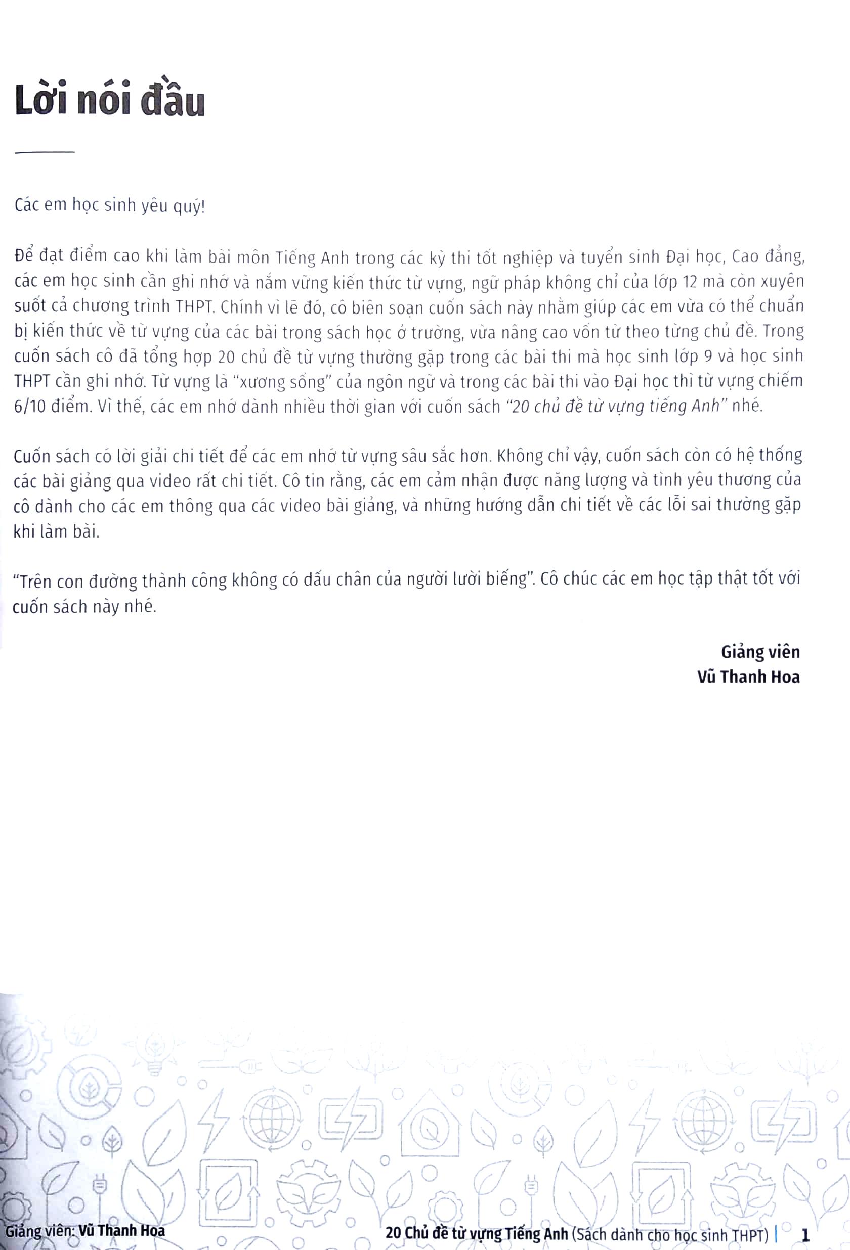 Để đạt điểm cao khi làm bài môn Tiếng Anh trong các kỳ thi tốt nghiệp và tuyển sinh Đại học, Cao đẳng, các em học sinh cần ghi nhớ và nắm vững kiến thức từ vựng, ngữ pháp không chỉ của lớp 12 mà còn xuyên suốt cả chương trình THPT. Chính vì lẽ đó, cô biên soạn cuốn sách này nhằm giúp các em vừa có thể chuẩn bị kiến thức về từ vựng của các bài trong sách học ở trường, vừa nâng cao vốn từ theo từng chủ đề. Trong cuốn sách cô đã tổng hợp 20 chủ đề từ vựng thường gặp trong các bài thi mà học sinh lớp 9 và học sinh THPT cần ghi nhớ. Từ vựng là “xương sống” của ngôn ngữ và trong các bài thi vào Đại học thì từ vựng chiếm 6/10 điểm. Vì thế, các em nhớ dành nhiều thời gian với cuốn sách “20 chủ đề từ vựng tiếng Anh” nhé.