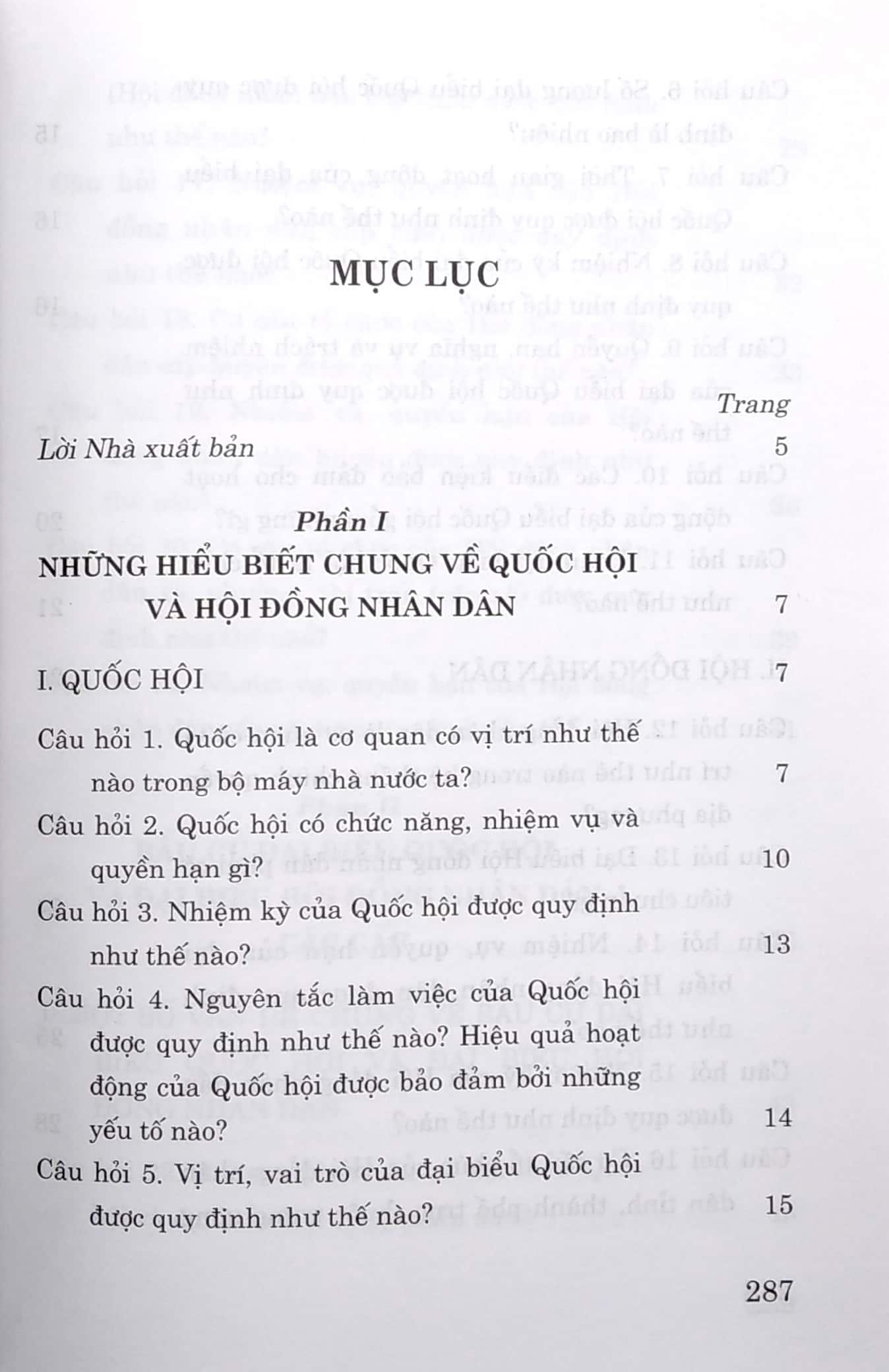 Phần I. Những hiểu biết chung về Quốc hội và Hội đồng nhân dân, gồm những câu hỏi và trả lời về vị trí, chức năng, nhiệm vụ, quyền hạn, tổ chức… của Quốc hội và Hội đồng nhân dân các cấp; vị trí, vai trò của đại biểu Quốc hội và đại biểu Hội đồng nhân dân, qua đó thấy được mục đích, ý nghĩa và tầm quan trọng của việc bầu cử đại biểu Quốc hội và đại biểu Hội đồng nhân dân các cấp.