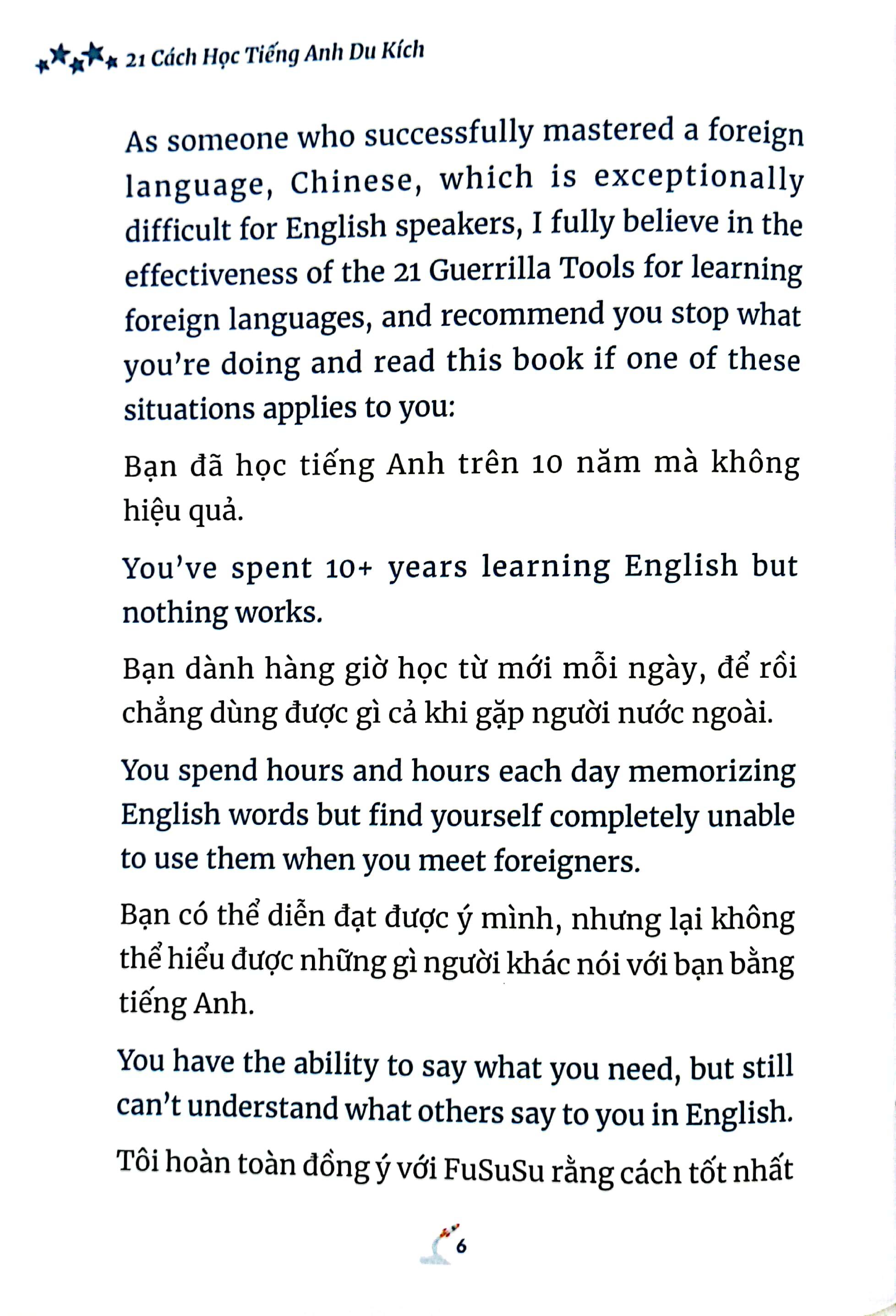 - Tự tin sử dụng tiếng Anh như một công cụ giúp bạn chinh phục mục tiêu, thăng tiến nhanh chóng. Hãy sở hữu ngay một cuốn 21 cách học tiếng Anh du kích, và bắt đầu hành trình biến tiếng Anh thành tiếng bố đẻ ngay từ hôm nay. Fususu là bút danh của Nguyễn Chu Nam Phương. Từng phải học lại tiếng Anh vỡ lòng, nhưng đã dịch hơn 6 cuốn sách của m.ình sang tiếng Anh, trong đó có 1 cuốn tiểu thuyết 100.000 chữ! Sợ phát âm sai, nhưng lại có thể đạt chức vô địch thuyết trình hài hước Toastmasters khu vực 5 nước Đông Nam Á (bằng tiếng Anh). Ngại giao tiếp, nhưng lại sáng lập CLB thuyết trình tiếng Anh ACI Toastmasters Online, giúp mọi người tự tin giao tiếp và thuyết trình tiếng Anh. Được công nhận là World Class Speaking Coach (Nhà Huấn Luyện Diễn Giả Quốc Tế) bởi nhà vô địch thuyết trình thế giới Craig Valentine. Điều đã giúp Nguyễn Chu Nam Phương thay đổi là niềm tin: Mọi thứ đều có thể, vấn đề là phương pháp. Có thể nói anh đã tìm ra con đường làm chủ tiếng Anh dễ dàng, hiệu quả.