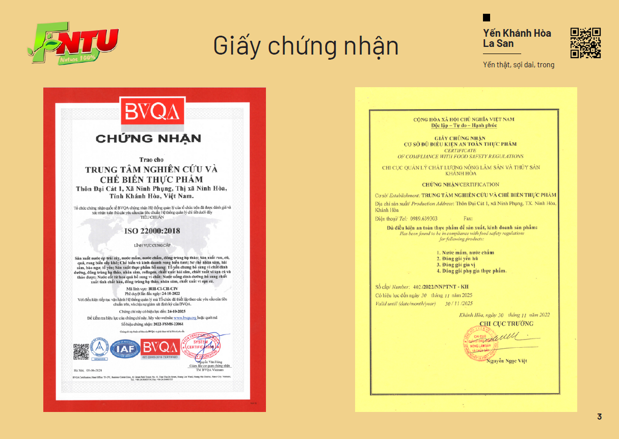 Thông tin sản phẩm : • Thành phần: Yến tươi tinh chế 30%, nước, Taurine(50mg),Lysine(50mg), glycine(25mg), nano canxi(25mg) đường phèn, chất ổn định (E406,E401), hương liệu. • Nơi sản xuất : Đại học Nha Trang