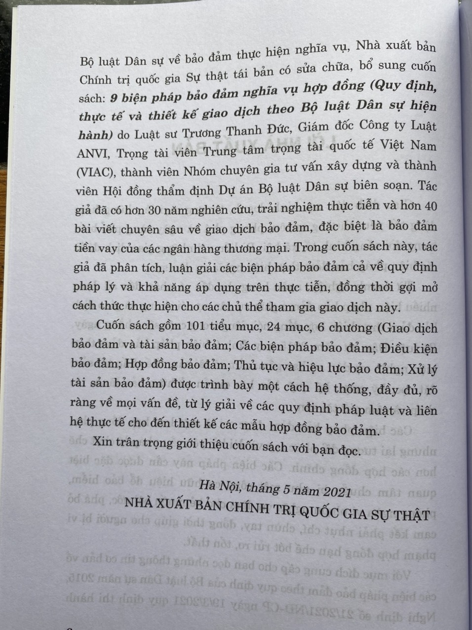 Mua tại TiktokCuốn sách “9 Biện Pháp Bảo Đảm Nghĩa Vụ Hợp Đồng” gồm 101 tiểu mục, 24 mục, 6 chương (Giao dịch bảo đảm và tài sản bảo đảm; Các biện pháp bảo đảm; Điều kiện bảo đảm; Hợp đồng bảo đảm; Thủ tục và hiệu lực bảo đảm; Xử lý tài sản bảo đảm) được trình bày một cách hệ thống, đầy đủ, rõ ràng về mọi vấn đề, từ lý giải về các quy định pháp luật và liên hệ thực tế cho đến thiết kế các mẫu hợp đồng bảo đảm.