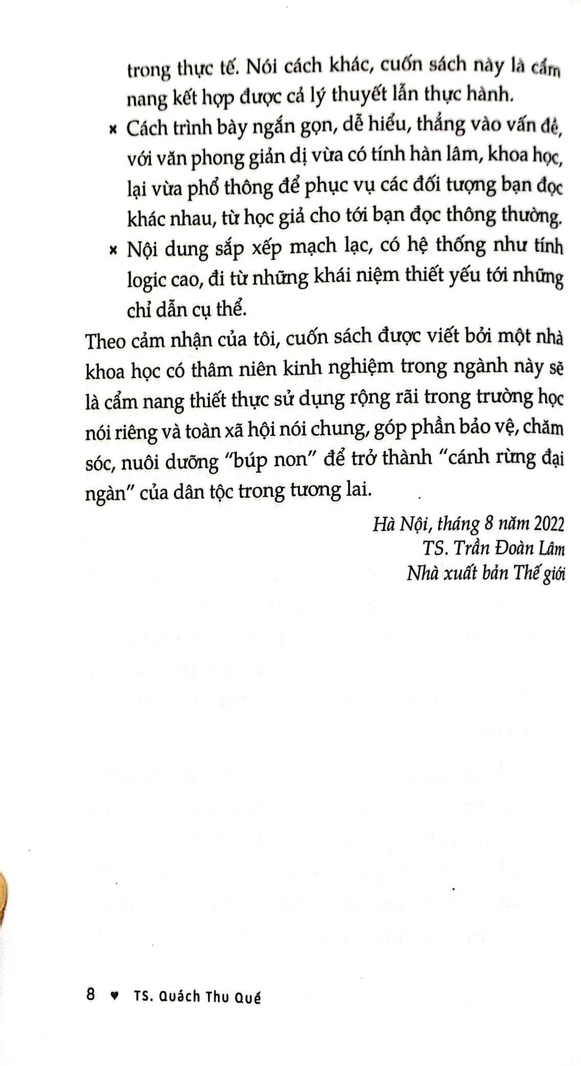 Tiến sĩ Quách Thu Quế là một nhà khoa học có thâm niên kinh nghiệm trong ngành bảo vệ bà mẹ trẻ em, với kinh nghiệm và kiến thức tích lũy nhiều năm, tác giả viết nên cuốn sách này, hy vọng trở thành cẩm nang thiết thực sử dụng rộng rãi trong trường học nói riêng và toàn xã hội nói chung, góp phần bảo vệ, chăm sóc, nuôi dưỡng “búp non” để trở thành “cánh rừng đại ngàn” của dân tộc trong tương lai.