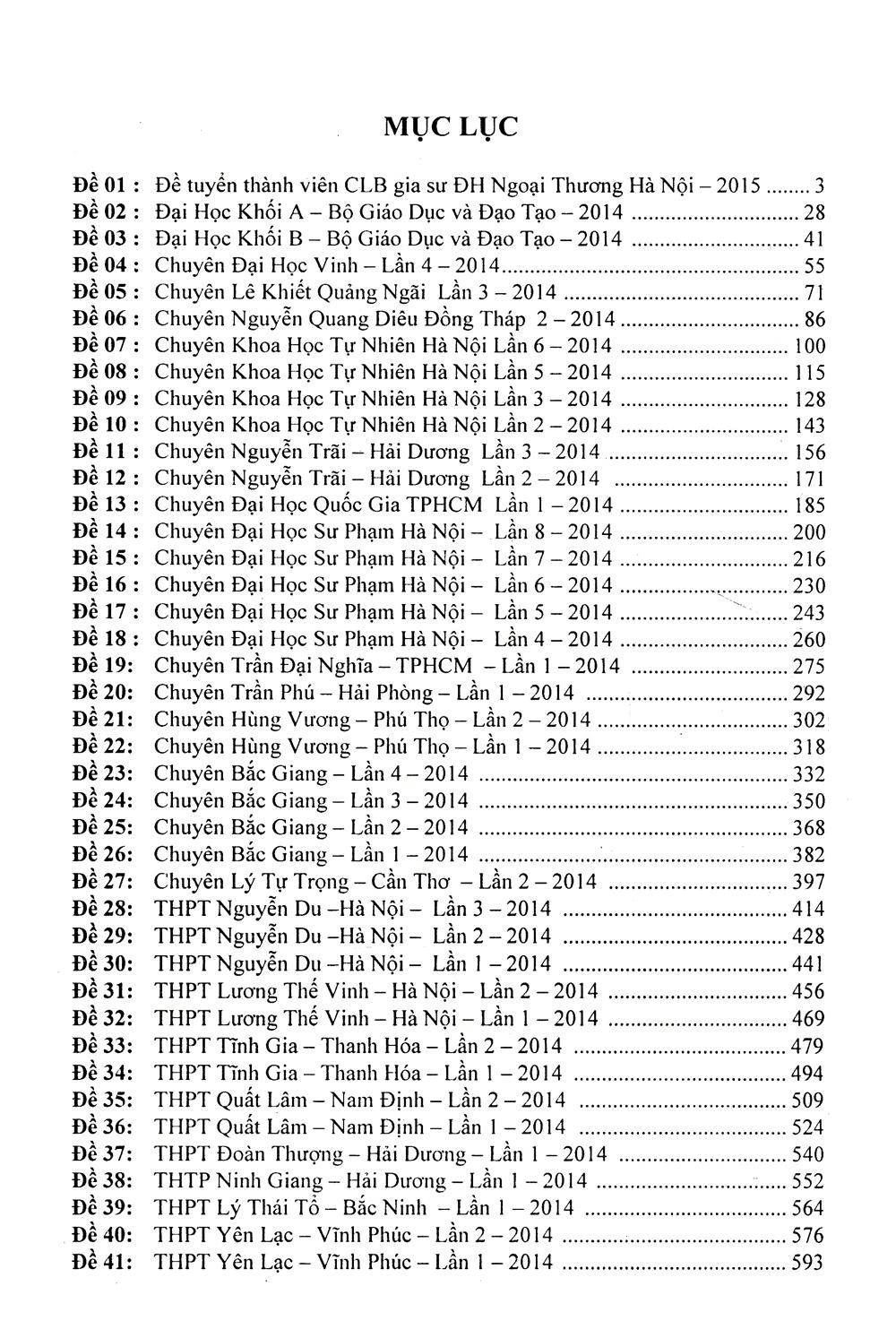 Cuốn sách được biên soạn từ các đề thi thử năm 2014 của các trường Chuyên. Đặc biệt là phần lời giải chi tiết với phương pháp đa dạng, phù hợp tính chất đề thi trắc nghiệm hiện nay. Cuốn sách có nhiều cách giải rất mới, đòi hỏi sự tư duy mới về bài tập về hóa học. Đây sẽ là tài liệu bổ ích giúp các em ôn luyện và đạt được kết quả tốt nhất trong kì thi Quốc gia.