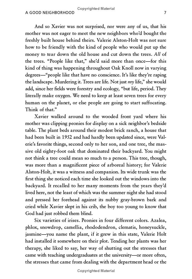 In Oak Knoll, a verdant, tight-knit North Carolina neighborhood, professor of forestry and ecology Valerie Alston-Holt is raising her bright and talented biracial son, Xavier, who’s headed to college in the fall. All is well until the Whitmans―a family with new money and a secretly troubled teenage daughter―raze the house and trees next door to build themselves a showplace.