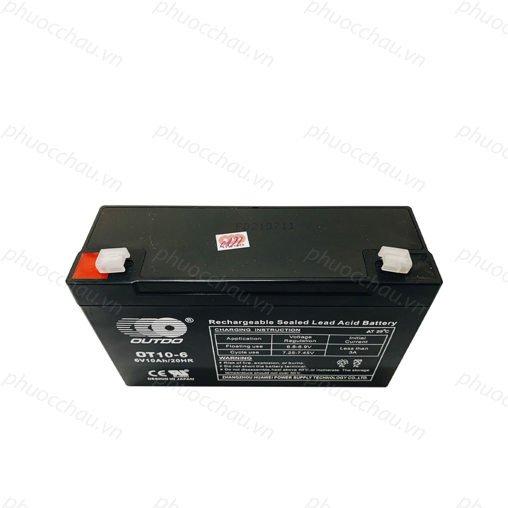 Ắc Quy Lưu Điện OUTDO OT10-6 Nhập khẩu: Trung Quốc Hãng sản xuất : Zhangzhou Huawei Power Supply Technology Co.,Ltd. Đặc tính : khô, kín khí Công suất : 6V10Ah Kích thước: Dài 151mm, Rộng