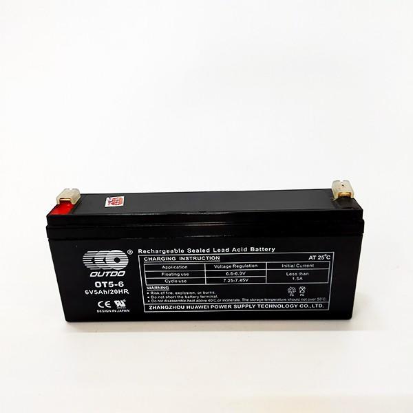 Ắc quy lưu điện OUTDO OT5-6 Nhập khẩu: Trung Quốc Hãng sản xuất : Zhangzhou Huawei Power Supply Technology Co.,Ltd. Đặc tính : khô, kín khí Công suất : 6V - 5AH Kích thước: Kích