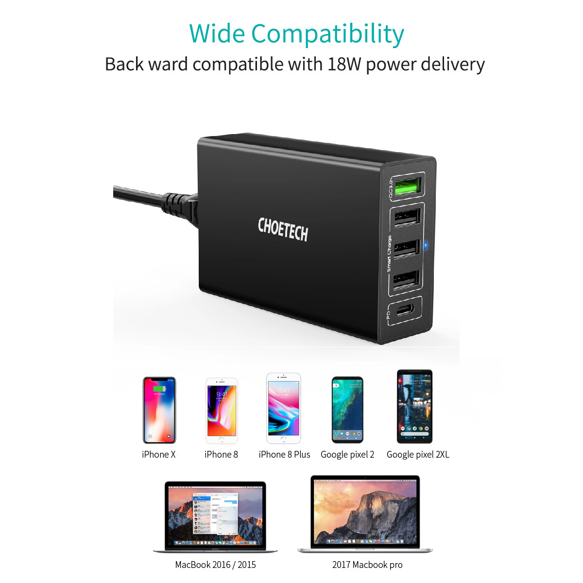 Cóc củ sạc nhanh 60W 4 cổng USB & 1 cổng PD Type-C hiệu CHOETECH Q3-4U2Q này hỗ trợ sạc nhanh Macbook dòng 30W và 1 cổng USB chuẩn QC 3.0 công suất 18W, thêm vào đó là 3 cổng USB hỗ trợ dòng 2.4A, với tổng công suất lên đến 60w khi sạc cùng lúc cả 5 cổng và dòng lên đến 6A.