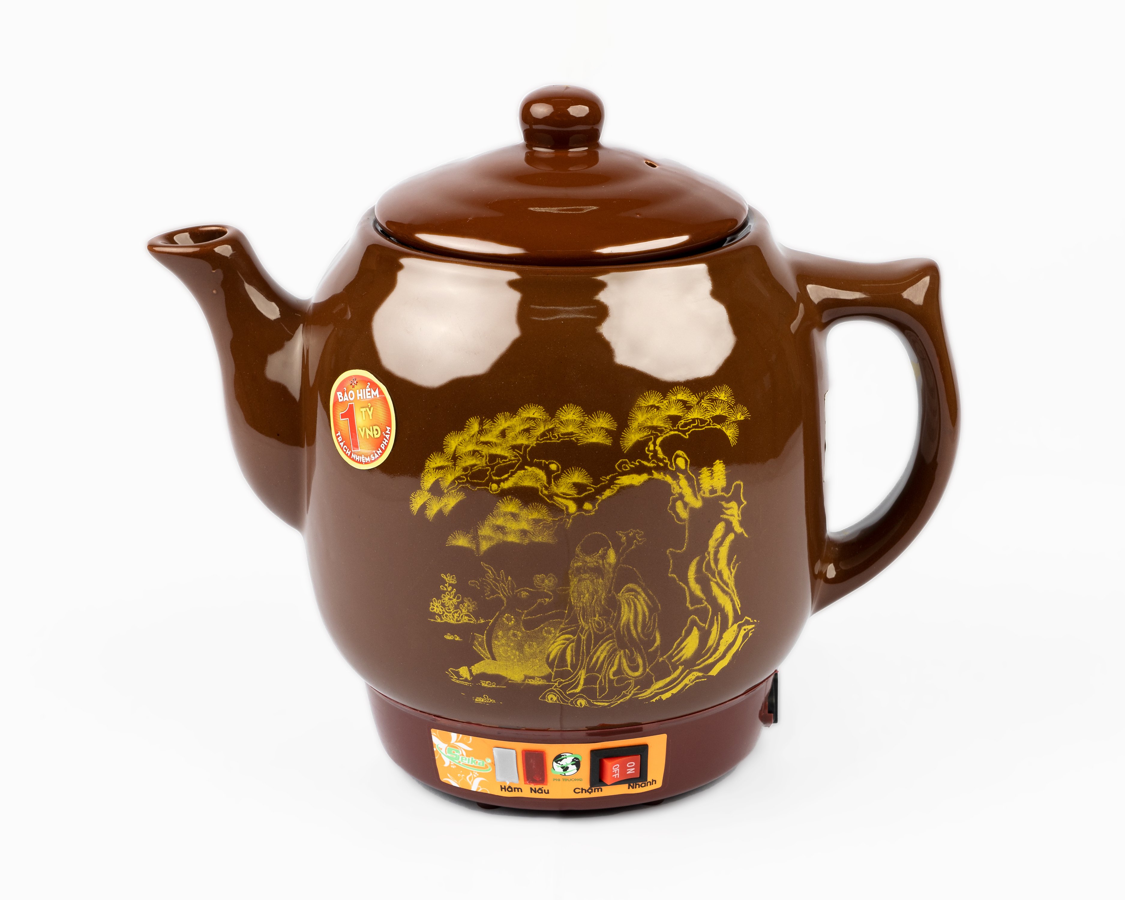 Dung tích: 2.8 L- Công suất: 450W- Thân ấm thiết kế với hoa văn ông già - củ sâm- Nguồn gốc sứ từ làng gốm Bát Tràng nổi tiếng- Chất liệu gốm được nung ở