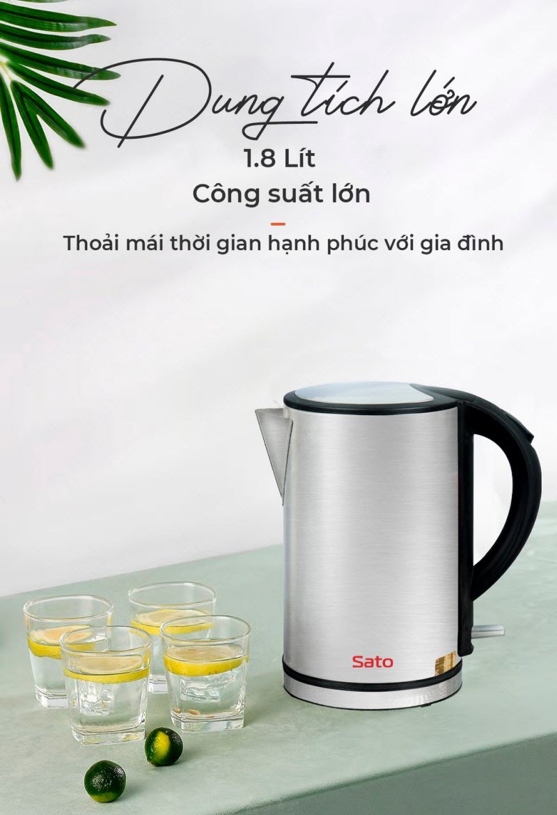 Mua tại TiktokĐặc điểm nổi bật Thân ấm bằng inox cao cấp không gỉ, an toàn sử dụng. Dung tích 1.8L, đế xoay 360 độ tiện dụng. Công suất 1500W đun sôi nước nhanh chóng. Tự động ngắt điện khi nước sôi hoặc khi ấm cạn nước. Công nghệ Nhật Bản - Sản xuất tại Việt Nam! Sản phẩm chính hãng Sato - Bảo hành 1 năm - Yên tâm sử dụng cùng #Sato !