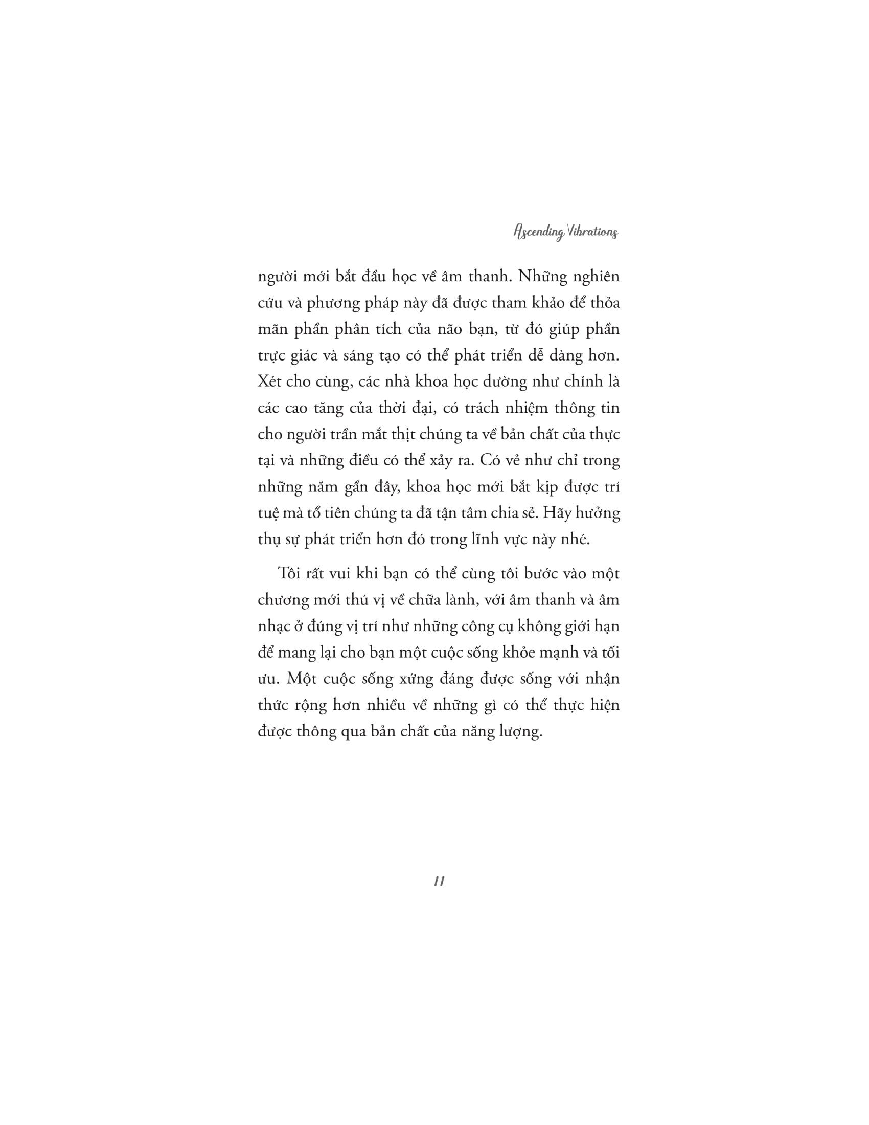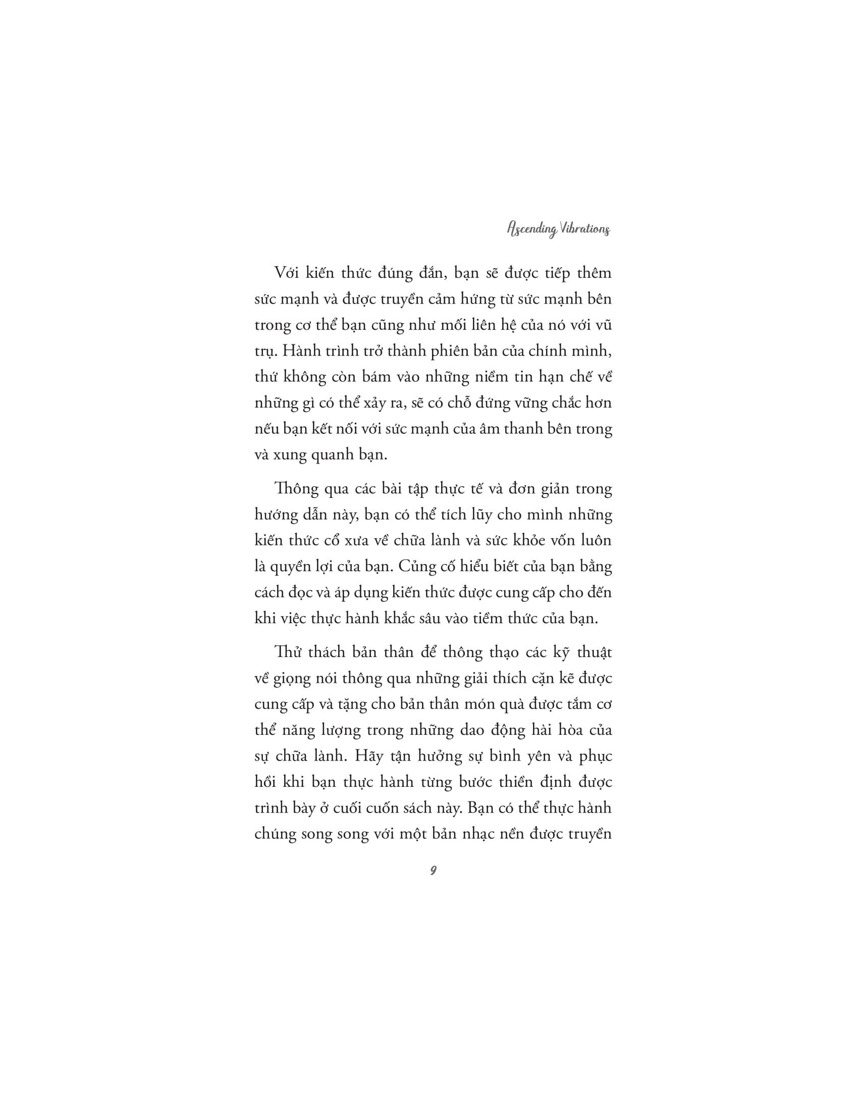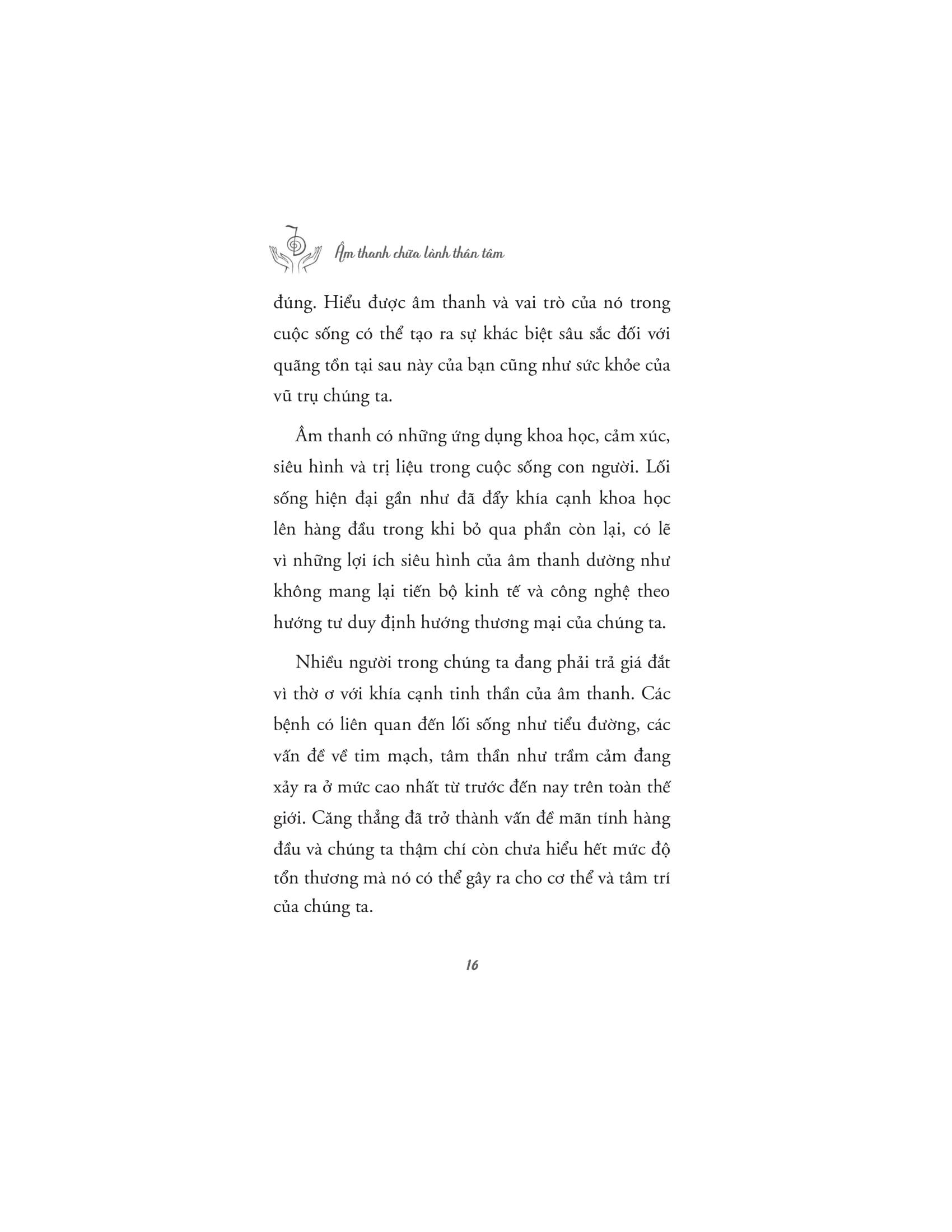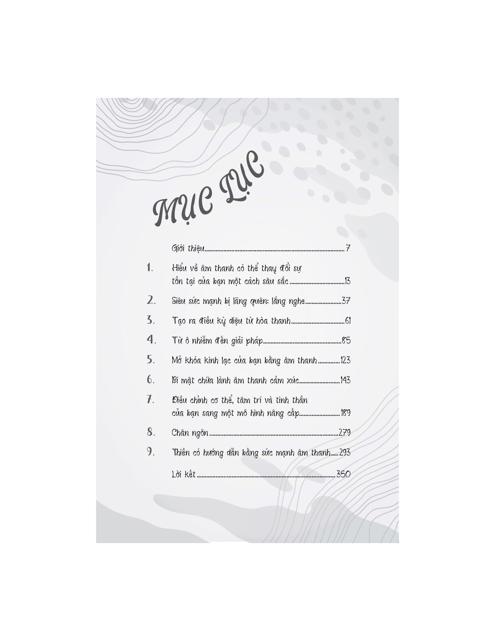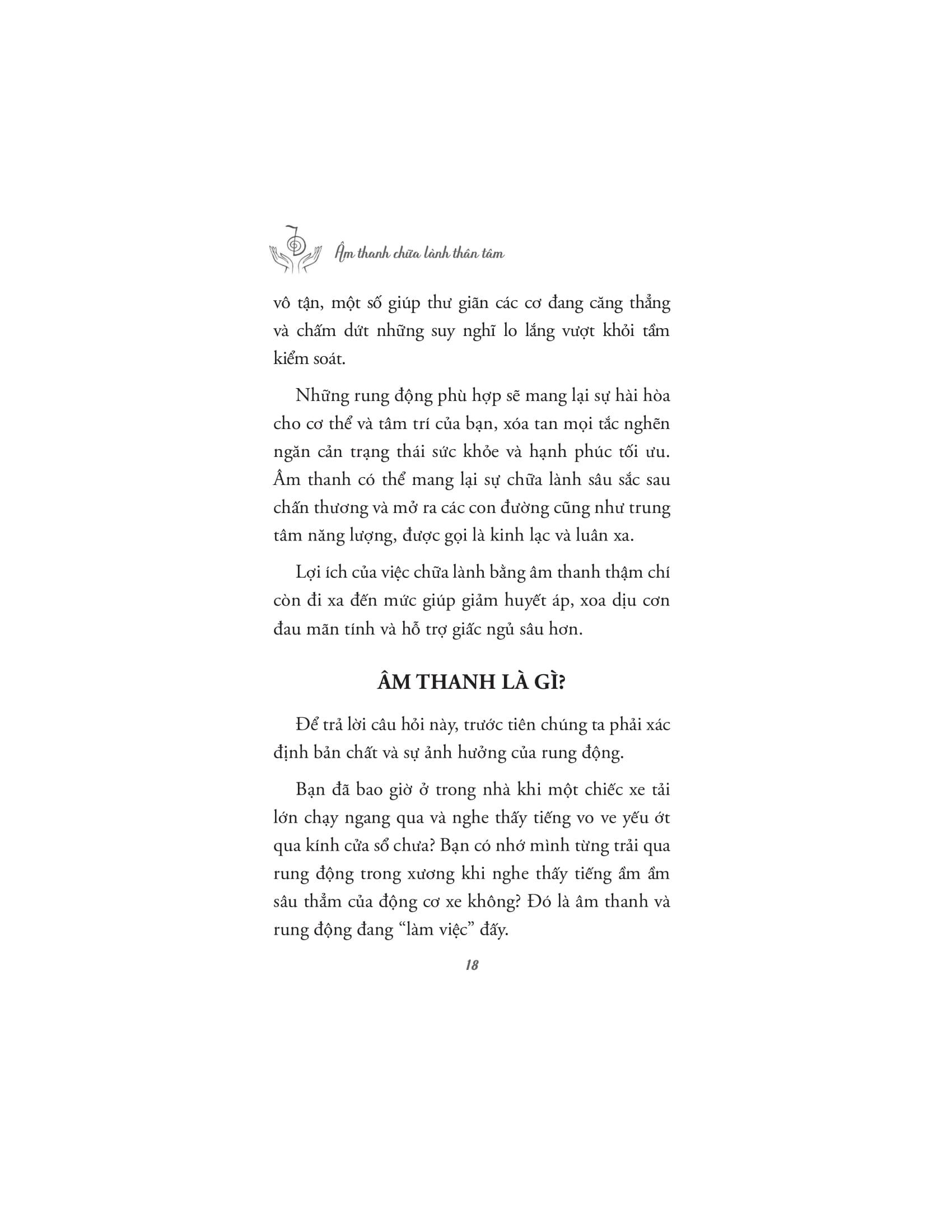 Tác giả dẫn dắt người đọc qua những ứng dụng khoa học, tâm linh và siêu hình của âm thanh, giải thích cách mà các liệu pháp âm thanh cổ xưa đã được sử dụng trong nhiều nền văn hóa khác nhau để chữa lành và cải thiện sức khỏe. Âm thanh không chỉ có khả năng tác động đến cảm xúc, mà còn có thể ảnh hưởng tích cực đến hệ thần kinh, hệ miễn dịch, và thậm chí là các luân xa, trung tâm năng lượng trong cơ thể con người. Với nhiều kỹ thuật và phương pháp trị liệu âm thanh khác nhau, những liệu pháp này giúp cơ thể thư giãn, giảm căng thẳng, loại bỏ tắc nghẽn năng lượng và khôi phục lại trạng thái cân bằng tự nhiên.