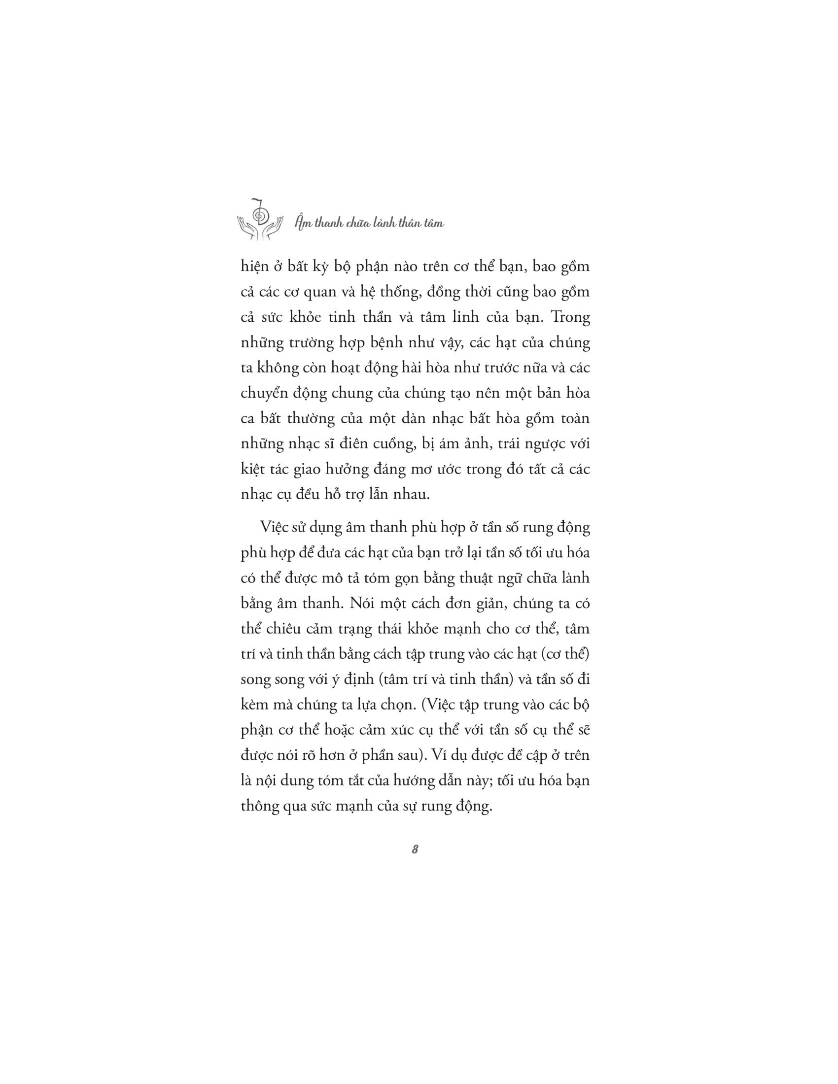"Âm thanh chữa lành thân tâm" là một cuốn sách không chỉ dành cho những người muốn tìm hiểu về âm nhạc và trị liệu, mà còn cho bất kỳ ai mong muốn khám phá sự kết nối giữa thân, tâm và vũ trụ thông qua các rung động của âm thanh.