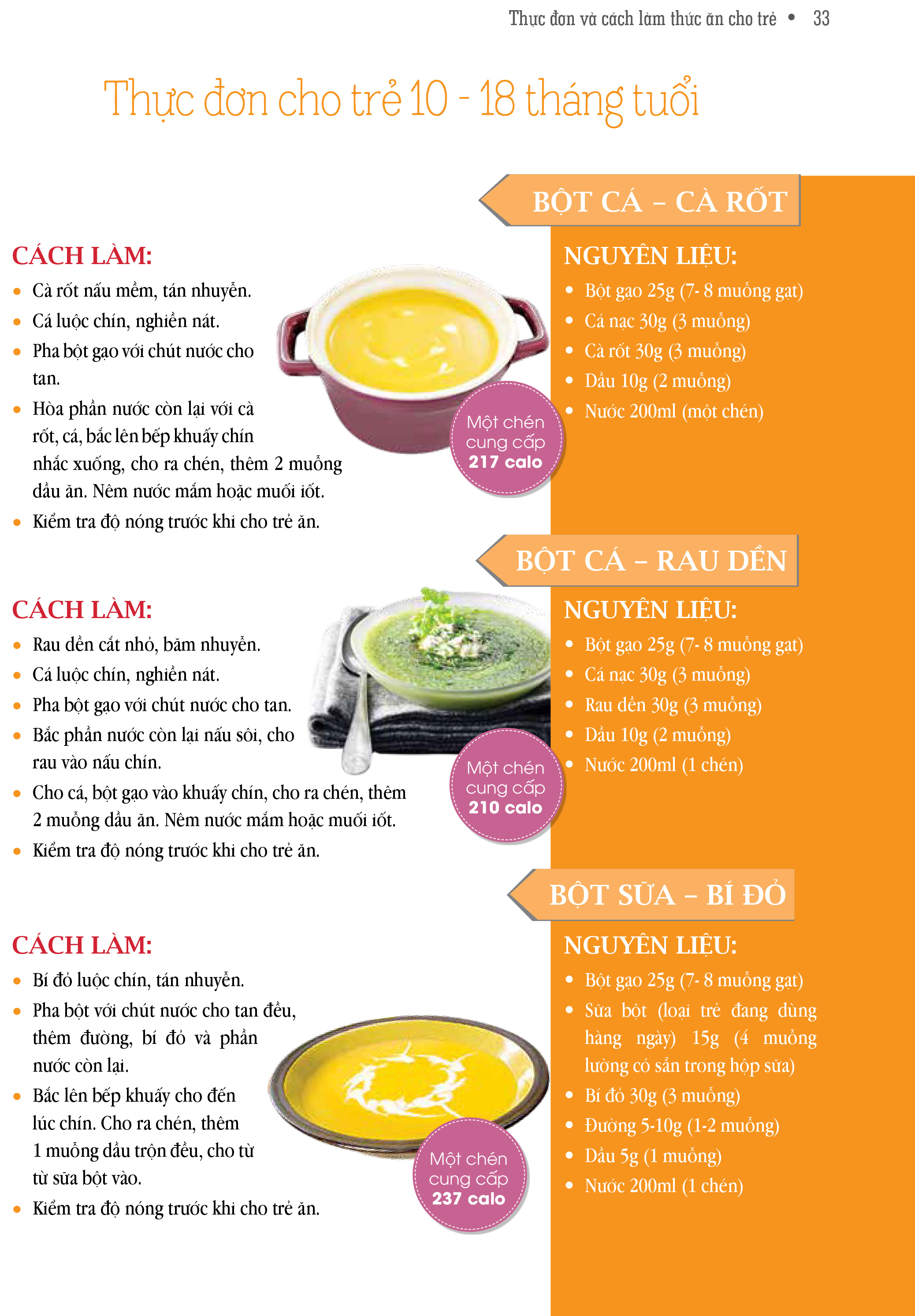 Đặc biệt, phần thực đơn với tính ứng dụng cao được nghiên cứu một cách kỹ lưỡng tại Trung tâm dinh dưỡng TP.HCM, dành riêng cho trẻ em Việt Nam với hướng dẫn chi tiết cách làm thức ăn cho trẻ và các thực đơn sử dụng ngôn ngữ hình ảnh sinh động, dễ chế biến nhưng rất hiệu quả, vừa bổ sung dinh dưỡng cho trẻ theo từng độ tuổi, vừa giúp trẻ trở nên thích thú với việc ăn uống.