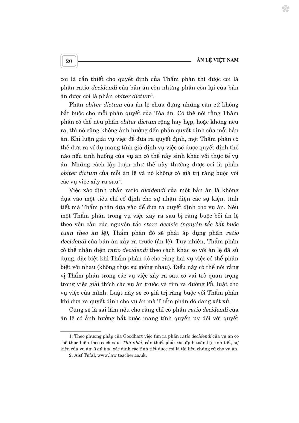 Trên cơ sở khái quát quá trình phát triển án lệ ở Việt Nam và kinh nghiệm xây dựng, áp dụng án lệ ở một số quốc gia trên thế giới, cuốn sách chuyên khảo Án lệ Việt Nam phân tích thực trạng áp dụng án lệ trong thực tiễn xét xử và khuyến nghị một số giải pháp nhằm nâng cao chất lượng quá trình nghiên cứu, đề xuất, công bố và áp dụng án lệ. Ngoài 3 chương chính, phần phụ lục của cuốn sách giới thiệu toàn văn 72 án lệ đã được công bố và phát triển từ các bản án, quyết định của Tòa án nhân dân các cấp. Đây là thành tựu quan trọng trong cải cách hoạt động tư pháp của ngành Tòa án nói chung, cũng như từ đóng góp của các tổ chức, nhà khoa học pháp lý, chuyên gia, luật sư trong hoạt động xây dựng và phát triển án lệ. Cuốn sách là tài liệu quý trong việc tìm hiểu, nghiên cứu và viện dẫn án lệ cho các Thẩm phán, Hội thẩm và các chức danh tư pháp của Tòa án, cũng như bạn đọc quan tâm đến vấn đề này. Trân trọng giới thiệu cuốn sách với bạn đọc
