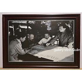 Ảnh gốc Chủ tịch Hồ Chí Minh – Đại tướng Võ Nguyên Giáp -Đ.c Trường Chinh – Đ.c Phạm Văn Đồng Chất liệu tranh in dầu trên lụa cao cấp được phủ lớp pe bảo vệ bề mặt tranh, ép trên tấm pomex dày 5mm độ bền màu trên 10 năm. -Tấm formex có trọng lượng nhẹ,không cong vênh mọi thời tiết, không thấm nước, dễ lau chùi bằng khăn ướt, không độc hại. -Khung bao tranh composite màu sẫm vân gỗ hoặc hoa văn vàng. Bức ảnh đen trắng này ghi lại khoảnh khắc họp bàn về Chiến dịch Điện Biên Phủ năm 1954, và những nhân vật lịch sử quan trọng trong ảnh thường được xác định là: Chủ tịch Hồ Chí Minh (ngồi giữa, râu bạc). Đại tướng Võ Nguyên Giáp (đứng bên phải, đang chỉ trên bản đồ). Ông Trường Chinh (ngồi bên trái, nhìn về phía bản đồ). Ông Phạm Văn Đồng (ngồi đối diện, giữa Hồ Chủ tịch và Võ Nguyên Giáp, đang nhìn bản đồ). Đây là cuộc họp bàn của Bộ Chính trị và Bộ Tổng tư lệnh về kế hoạch tác chiến cho chiến dịch lịch sử này. Bản đồ trên bàn thường là bản đồ tác chiến Chiến dịch Điện Biên Phủ. Bức ảnh lịch sử này được chụp vào tháng 12 năm 1953 tại Tỉn Keo, Định Hóa, Thái Nguyên (khu căn cứ Việt Bắc). Đây là bối cảnh diễn ra cuộc họp quan trọng của Bộ Chính trị (mở rộng) dưới sự chủ trì của Chủ tịch Hồ Chí Minh để thông qua quyết tâm chiến lược, chính thức quyết định mở Chiến dịch Điện Biên Phủ (Đông Xuân 1953-1954). Thời gian: Tháng 12 năm 1953 (Thường được xác định là ngày 6 tháng 12 năm 1953, theo tư liệu của Bảo tàng Lịch sử Quân sự Việt Nam). Địa điểm: Lán Tỉn Keo (một căn lán đơn sơ trong khu rừng thuộc khu căn cứ Việt Bắc), thuộc xã Phú Đình, huyện Định Hóa, tỉnh Thái Nguyên.