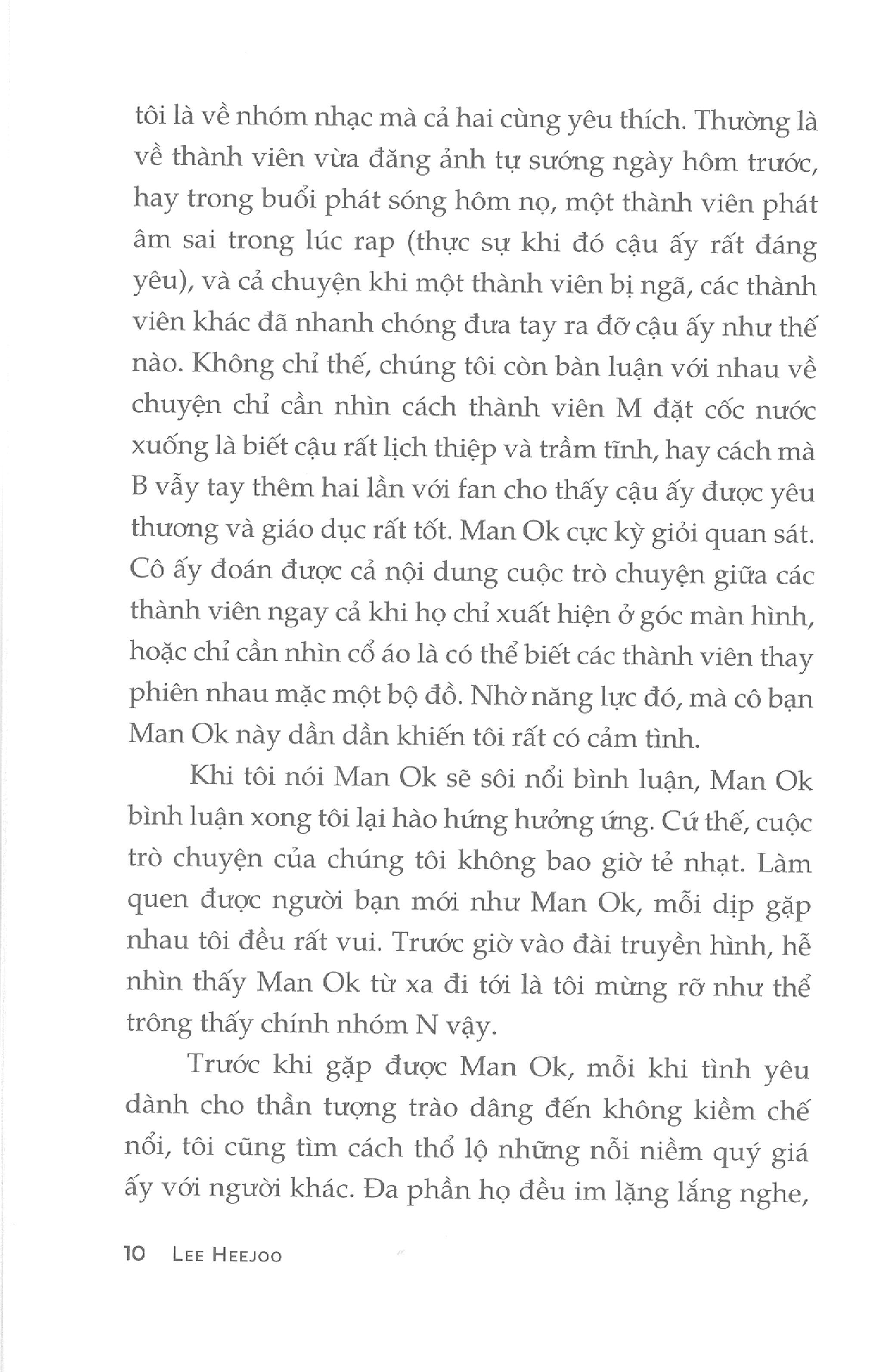 Trước đây tớ không hiểu nổi đám đông người hâm mộ được quay lên ti vi, hoặc là tớ đã được dạy để không thể hiểu được họ. Họ hướng về phía những ca sĩ đang đứng trên sân khấu, gào thét, khóc lóc vật vã đến mức người ta muốn đặt câu hỏi, rốt cuộc là thứ cảm xúc mãnh liệt gì đã khiến họ như vậy. Bất cứ khi nào nhìn thấy các fan cuồng cư xử như thể nếu cần sẽ sẵn sàng rút ruột rút gan ra dâng hiến, bố tớ luôn tặc lưỡi bảo tớ đừng bao giờ làm như họ. Tớ lúc nào cũng đáp lại “vâng, thưa bố”. Nhưng tớ đáp vậy không phải để làm vừa lòng bố, mà quả thực khi ấy, tớ chỉ hiểu và nhìn thế giới như những gì bố tớ nhìn và hiểu mà thôi. Lúc ấy, tớ không thể hiểu được tại sao nhất định phải đi xa như vậy và gào thét như thế, trong khi chỉ cần bật ti vi lên là có thể nhìn được thần tượng gần thế này rồi.