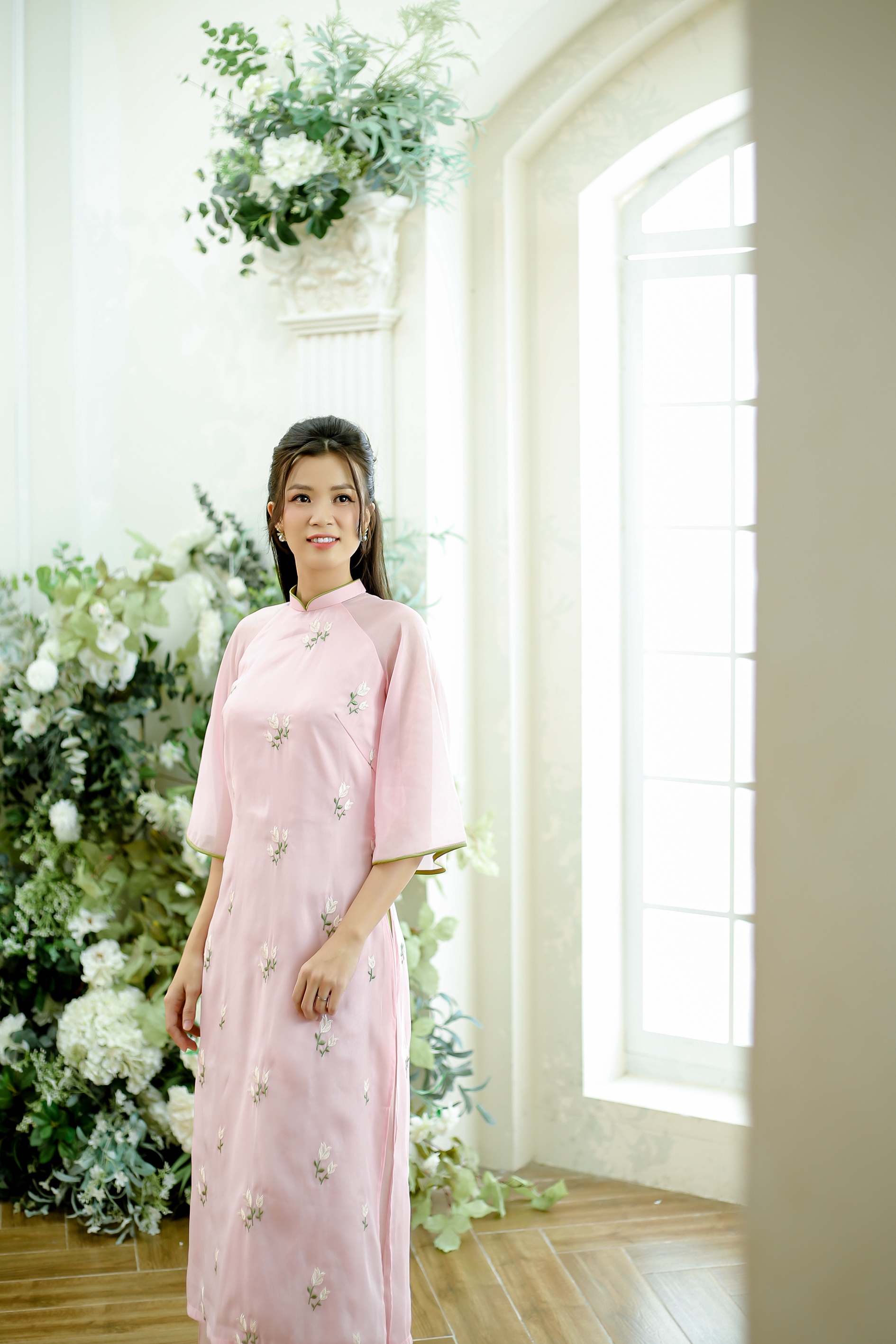Áo dài cách tân thiết kế 4 tà may vải tơ màu hồng nhạt thêu hoa lá, lót lụa bên trong, tay lỡ loe viền màu xanh bơ, quần lụa xanh bơ
