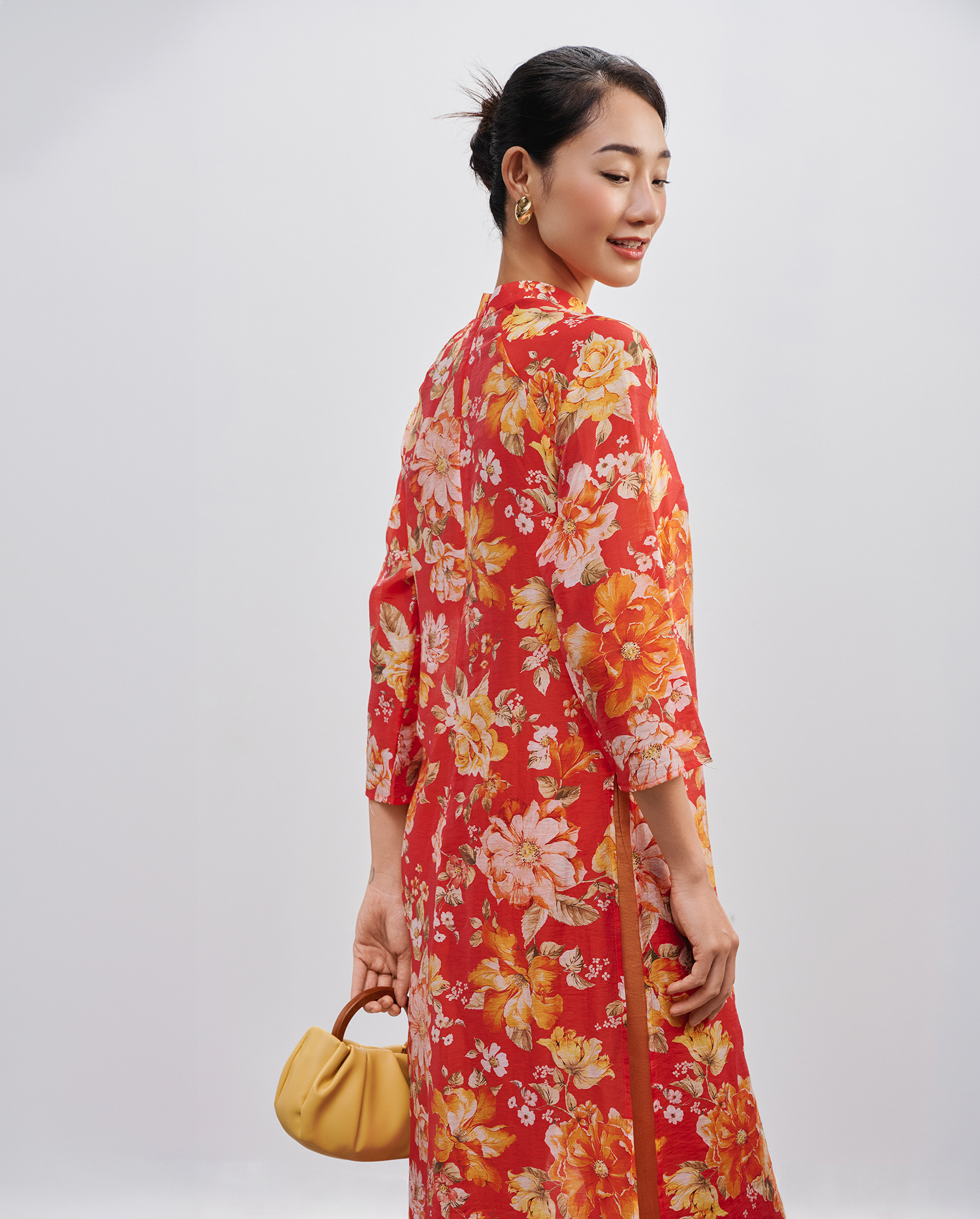 Khoác lên mình thiết kế này, ta như lạc vào một khu vườn nhiệt đới ngập tràn sức sống. Trên nền vải linen mềm mại, thoáng đãng – chất liệu lý tưởng cho những ngày ngập nắng – những đóa hoa bung nở với gam màu đỏ cam nồng ấm chủ đạo, điểm xuyết sắc vàng rực rỡ và những vệt cam cháy bỏng. Mỗi họa tiết như một nét vẽ phóng khoáng, không cầu kỳ mà vẫn đủ sức lay động mọi ánh nhìn, gợi lên cảm giác về một mùa hè sôi động, một nguồn năng lượng tươi mới, căng tràn.