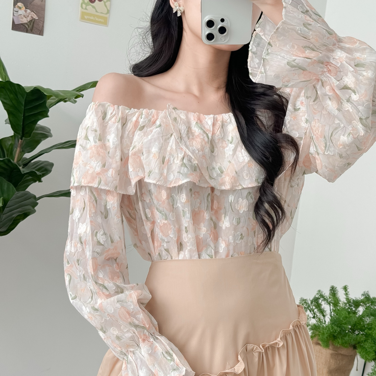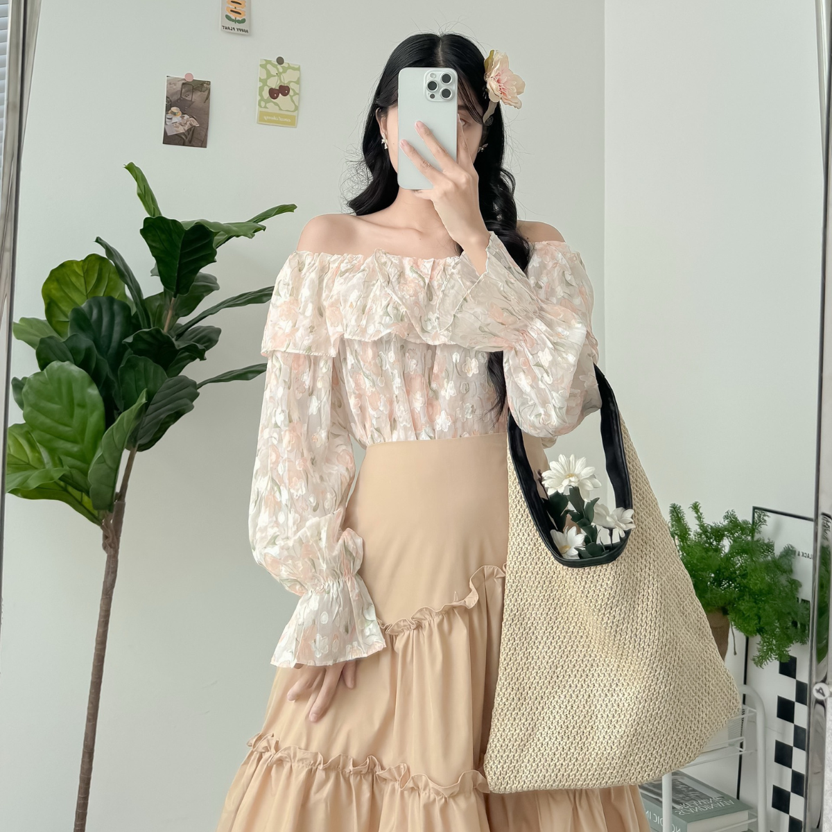 Áo nữ trễ vai hoa nhí vải lụa phối đồ chân váy bút chì