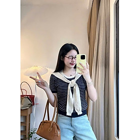 ✨Áo Len Mongtoghi Kẻ Nhỏ Tay Ngắn Phối Khăn Muối Tiêu – Sọc Xanh, Sọc Kem
