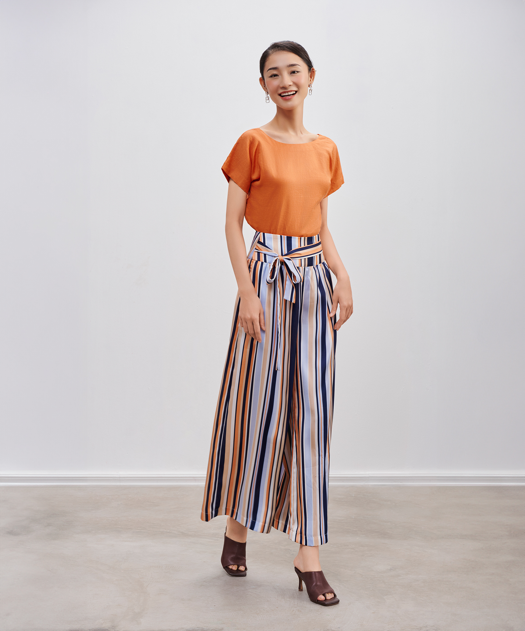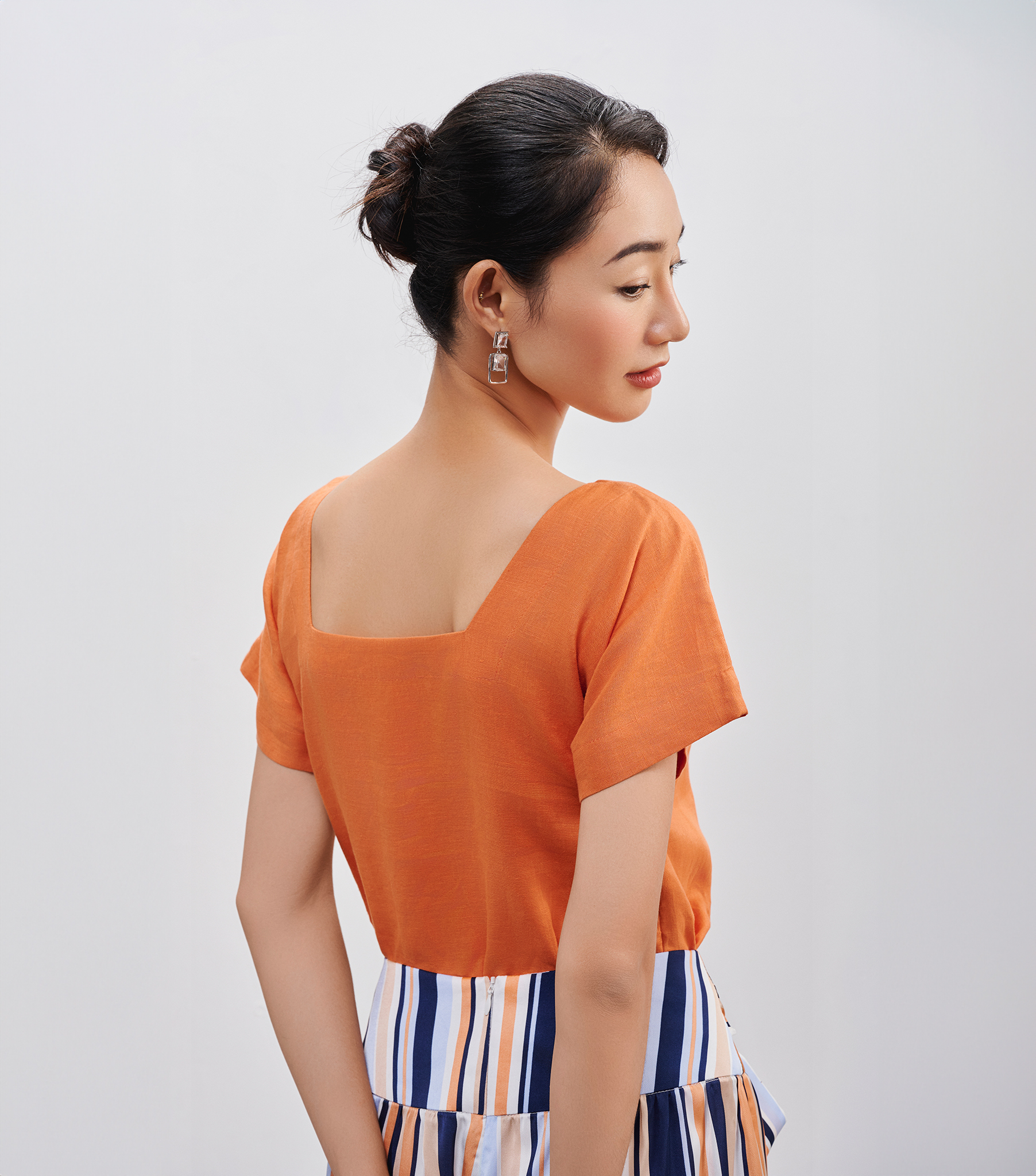 Áo dáng suông, với phần cổ cách điệu được nhún li ngực tạo phom suông rộng trẻ trung. Áo với điểm nhấn là hàng khuy trai 1 bên vài và tay bo kẹp bèo nhí