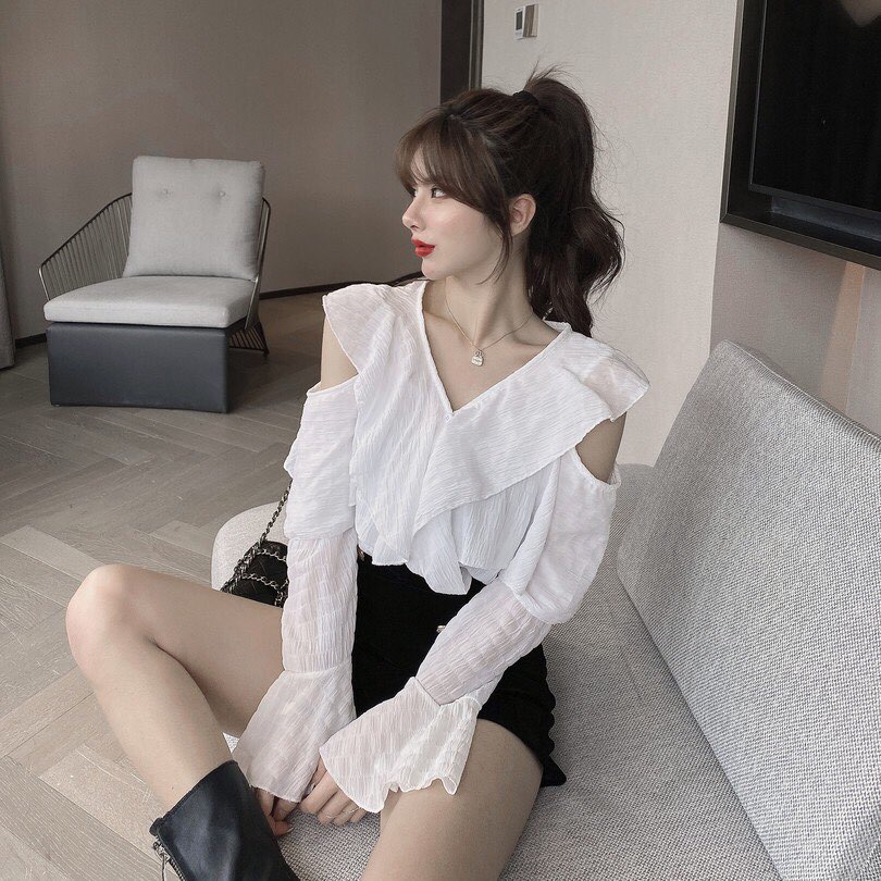 ✨Áo sơ mi nữ thời trang dài tay hở vai nhún bèo - Hàng cao cấp