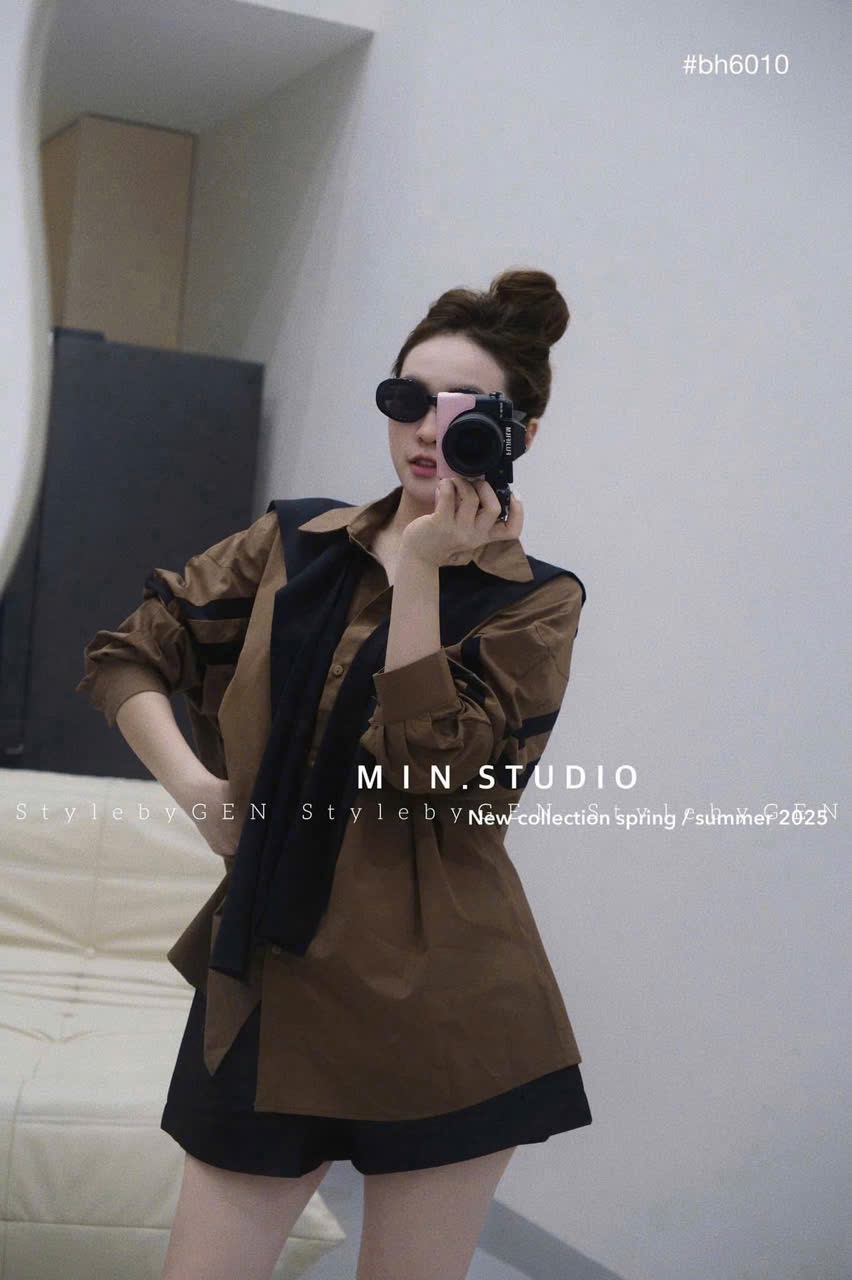 ✨Áo sơ mi thô tay dài nâu kèm khăn siêu HOT