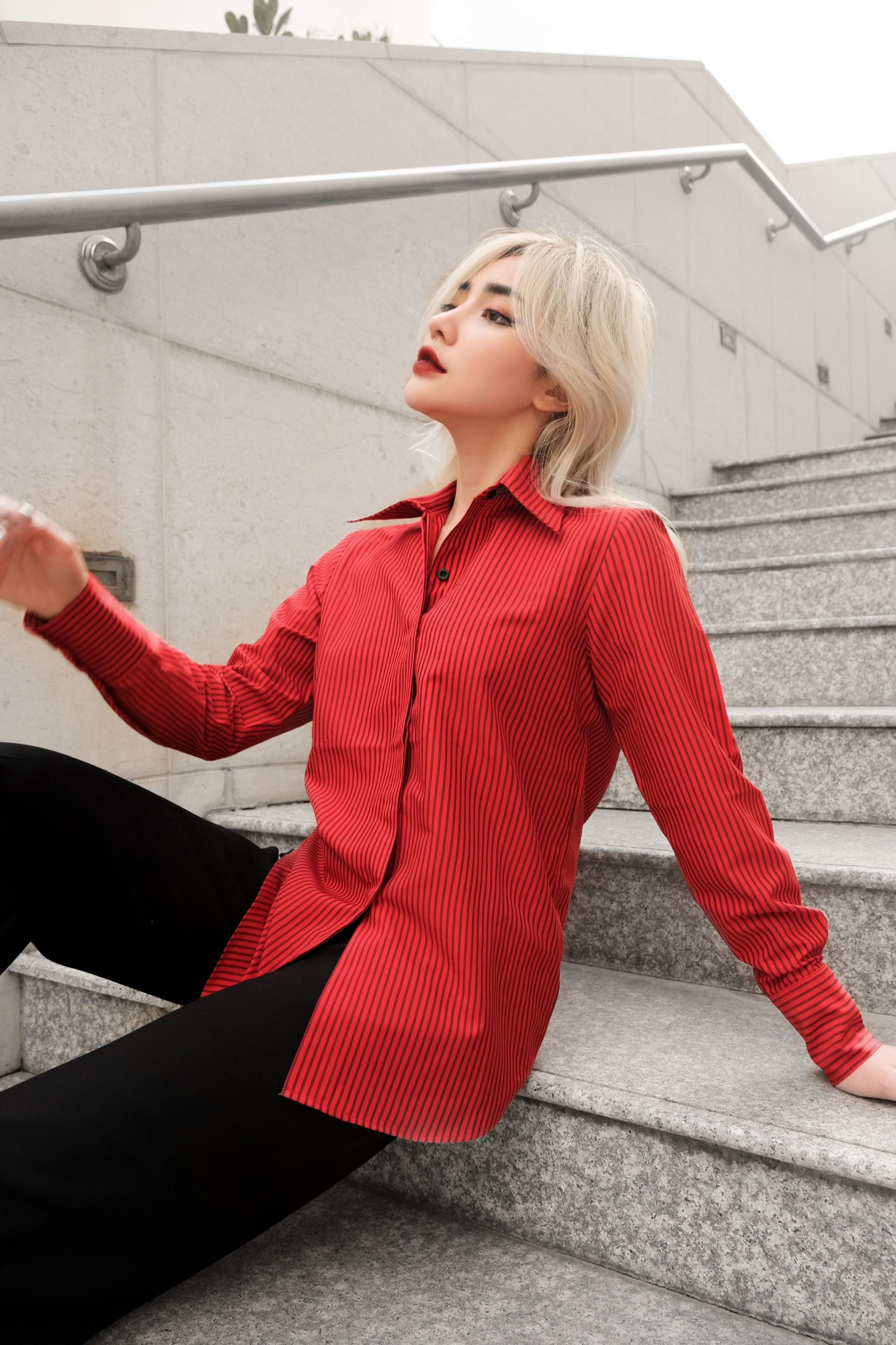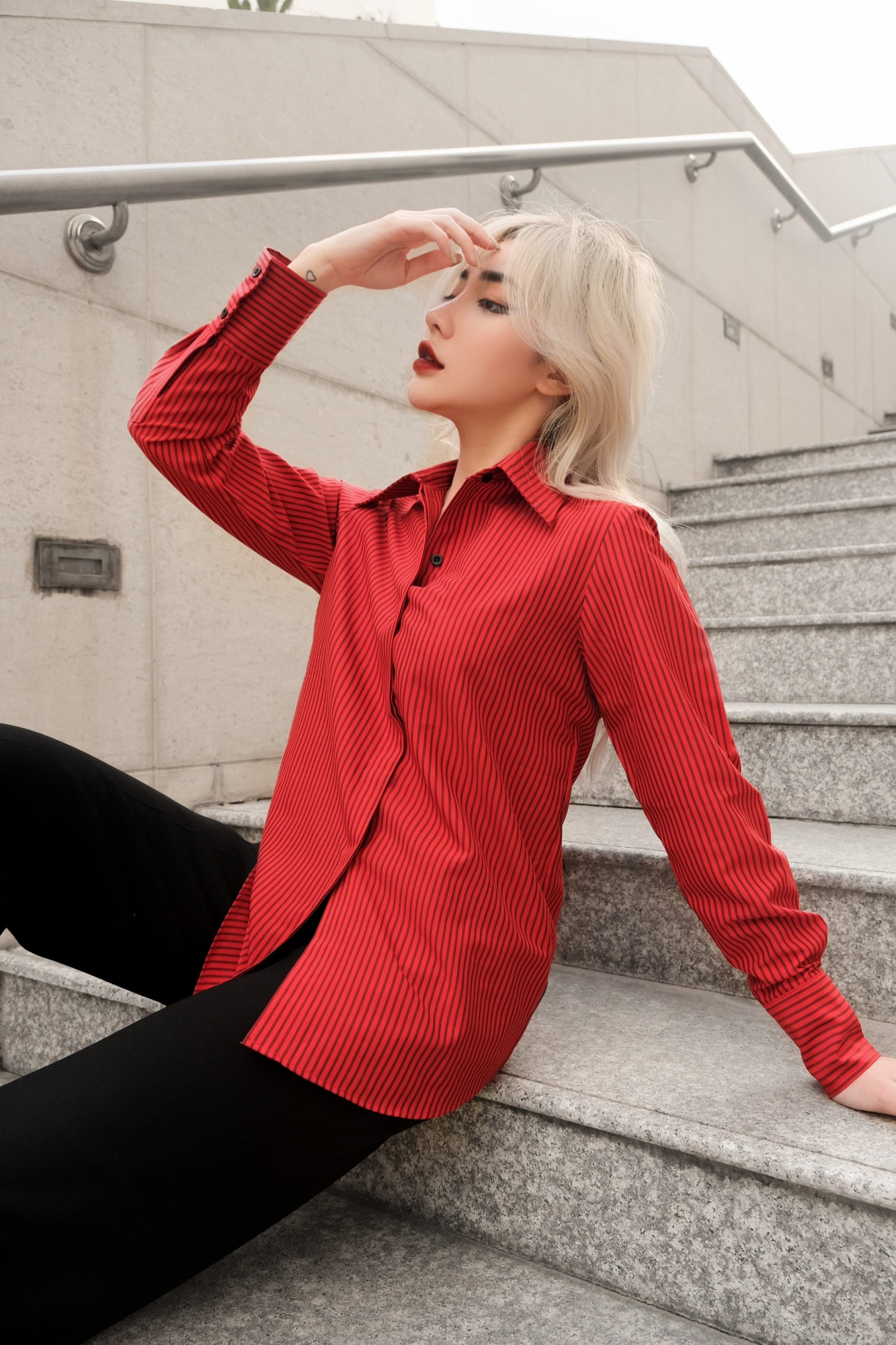 CHẤT SOMI COTTON PHA, ĐỨNG PHOM ÁO MÀU ĐỎ SỌC ĐEN ÁO CỔ SOMI, TAY DÀI, NẸP ÁO GIẤU NÚT PHOM CĂN BẢN SUÔN ĐIỂM NHẤN TAG LOGO NGAY NẸP ÁO