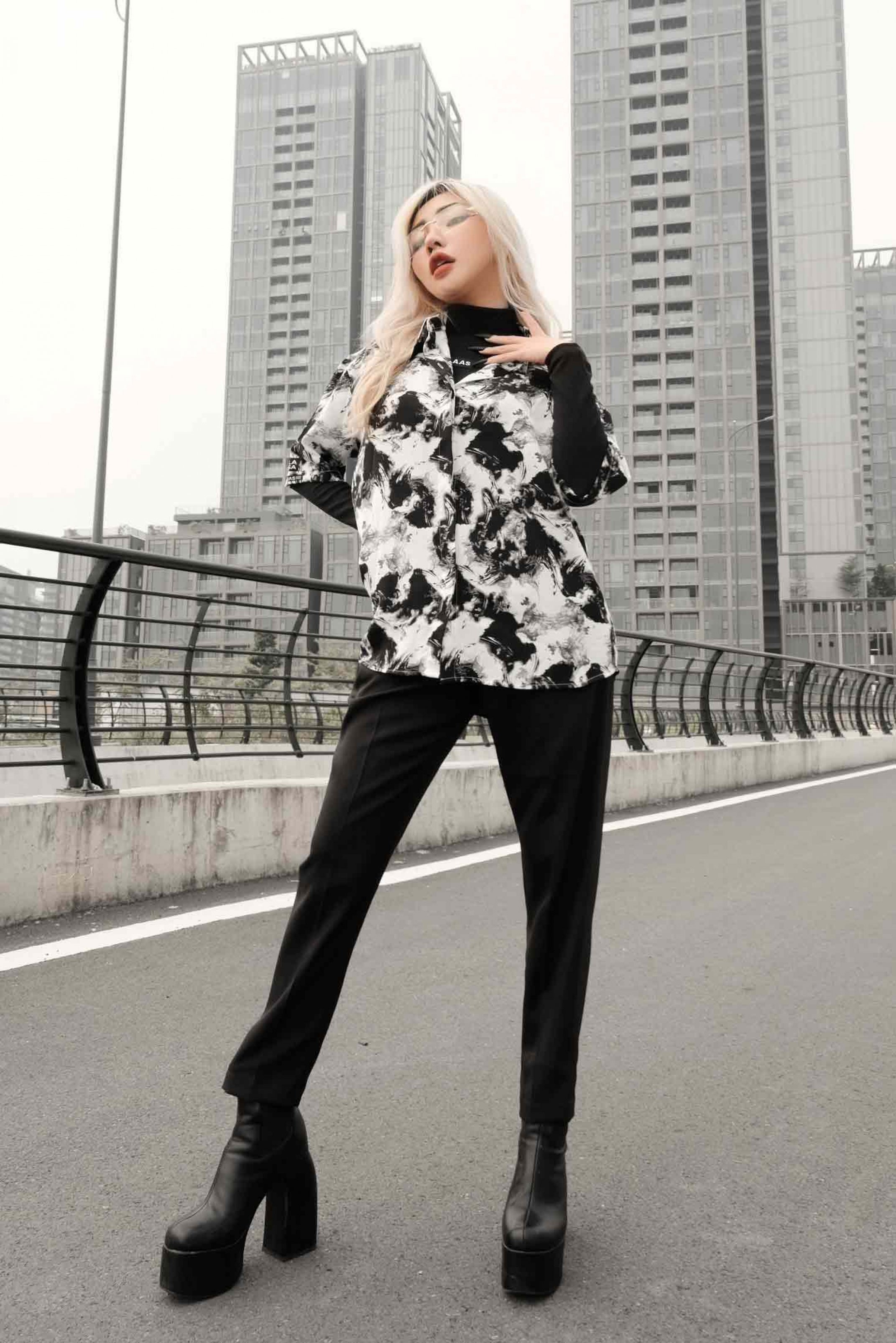 CHẤT LIỆU MANGO, MỀM MƯỢT, KHÔNG NHĂN ÁO MÀU TRẮNG, HOẠ TIẾT MÀU ĐEN ÁO SOMI NẸP GIẤU NÚT FORM RỘNG FREESIZE ĐIỂM NHẤN 1 BÊN TAY PHẢI ÁO GẮN TAG LOGO LAAS
