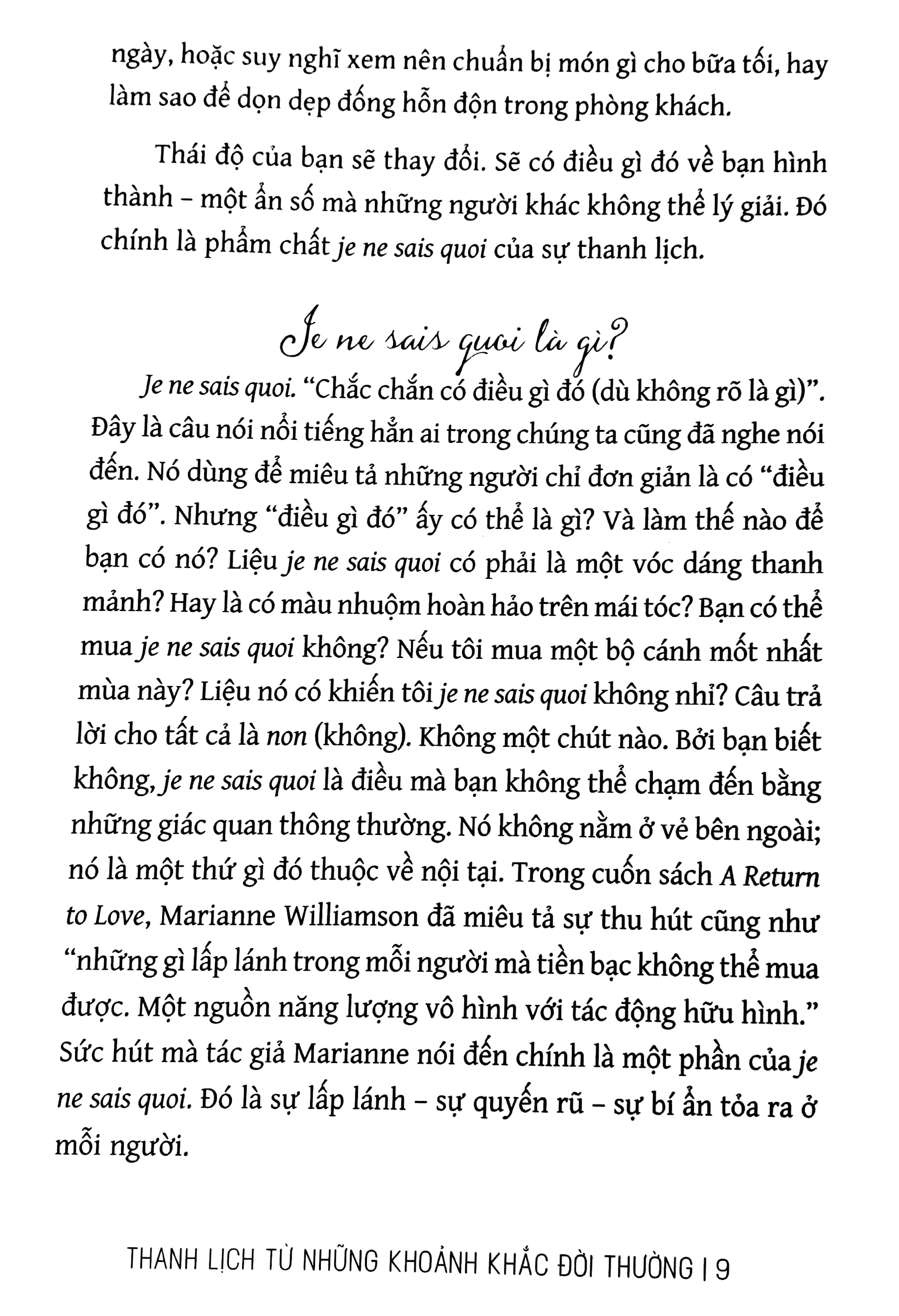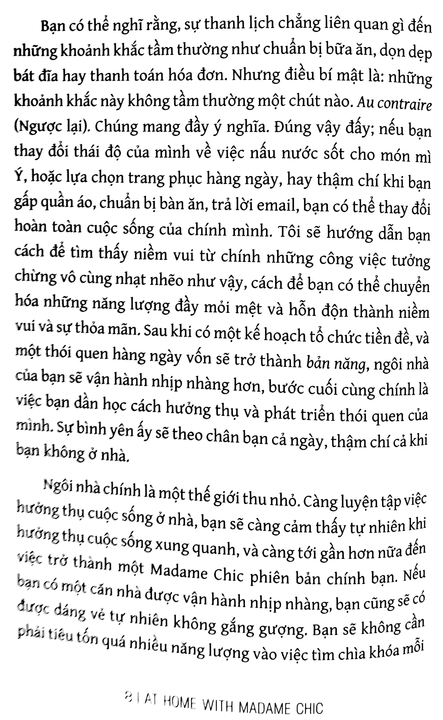 “Bạn có thể nghĩ rằng, sự thanh lịch chẳng liên quan gì đến những khoảnh khắc rất đỗi đời thường như chuẩn bị bữa ăn, dọn dẹp bát đĩa hay thanh toán hóa đơn. Nhưng điều bí mật là: Những khoảnh khắc này không tầm thường một chút nào. Au contraire (Ngược lại). Chúng mang đầy ý nghĩa. Nếu bạn thay đổi thái độ của mình ngay từ những việc nhỏ nhất – bạn có thể thay đổi hoàn toàn cuộc sống của chính mình.”