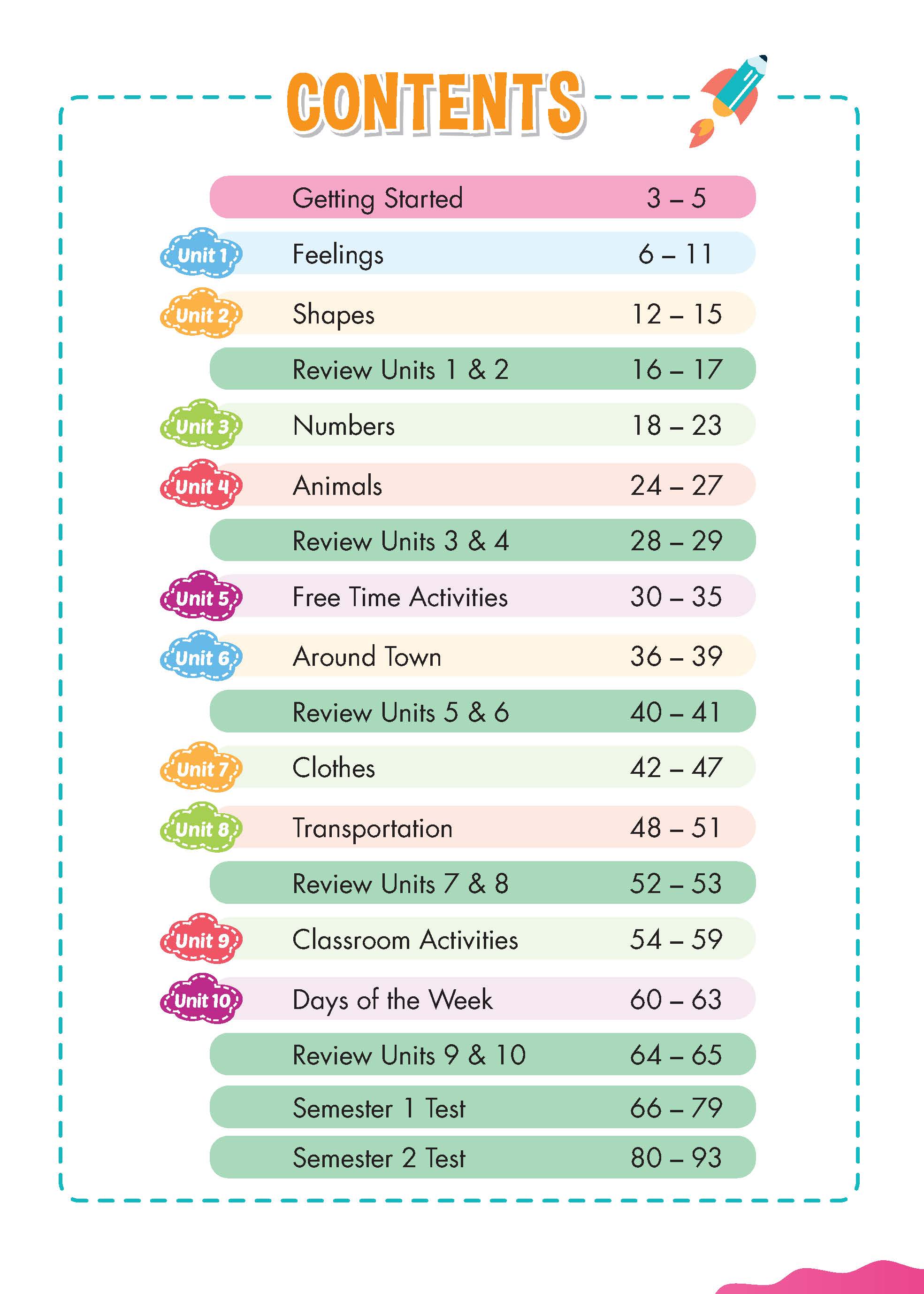 Sách : Learning English - Tiếng Anh Lớp 2 & Lớp 3 (7 - 9 Tuổi ) Nội Dung : - Bảng mục lục: Chỉ rõ các mục tiêu chính và trọng tâm của mỗi