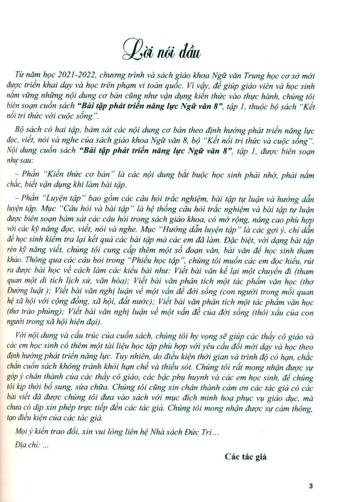 Từ năm học 2021-2002, chương trình và sách giáo khoa Ngữ văn Trung học Cơ sở mới được triển khai dạy và học trên phạm vi toàn quốc. Để góp phần giúp giáo viên, phụ huynh và học sinh nắm vững những nội dung cơ bản cũng như vận dụng kiến thức vào thực hành, chúng tôi biên soạn bộ sách "Bài tập phát triển năng lực Ngữ văn 8".