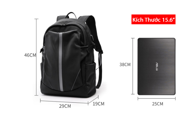 Kích thước: rộng 29cm X cao 41cm X dày 14cm Trọng lượng: 0.6 kg Dung tích: laptop 15.6 inch Màu sắc: Đen, Xám, Xanh Phương pháp sản xuất: công nghệ cao Chất liệu : Vải
