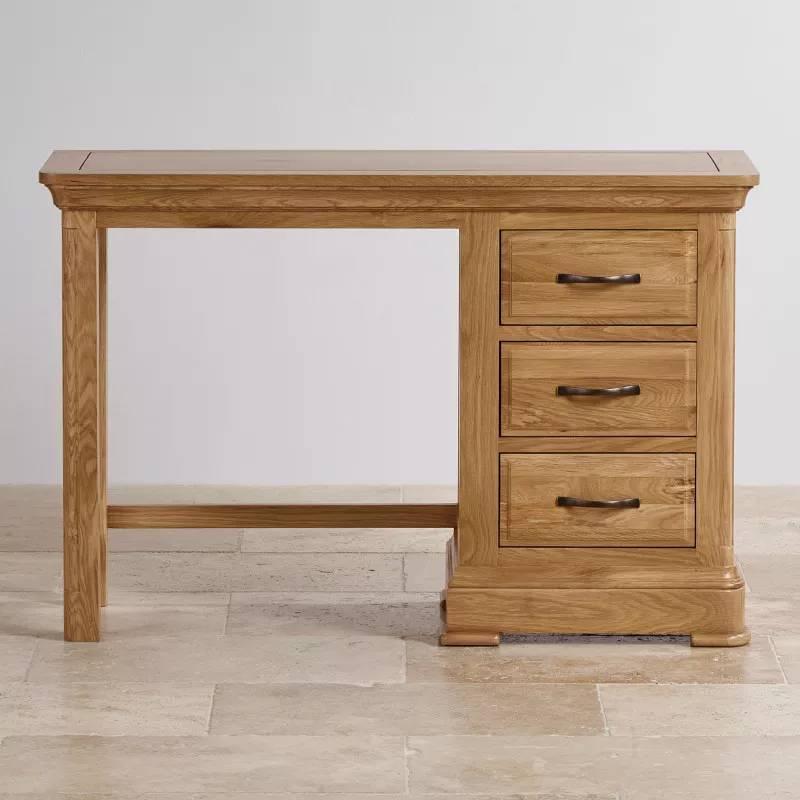Bàn trang điểm 3 ngăn kéo Canterbury được làm từ gỗ sồi trắng Mỹ nhập khẩu có độ bền cao với tông màu tươi sáng và ấm áp. Đây sẽ là mảnh ghép hoàn hảo cho bất kì phong cách phòng ngủ nào. Ba ngăn kéo được làm thủ công, kết cấu chắc chắn, dùng để lưu trữ những đồ dùng trang điểm và các phụ kiện cần thiết khác. Chiếc bàn mang một vẻ ngoài tuyệt đẹp, với tay cầm kim loại màu đen ấn tượng và các yếu tố thiết kế lấy cảm hứng từ đồ nội thất truyền thống. Sản phẩm mang đặc trưng của bộ sưu tập Canterbury như chi tiết cắt góc tròn cạnh tinh tế và các mặt ngăn kéo giật cấp cổ điển tăng thêm phần nổi bật. Đừng quên phối hợp mẫu ghế cùng bộ sưu tập để tạo sự đồng bộ và hài hòa cho thiết kế này.