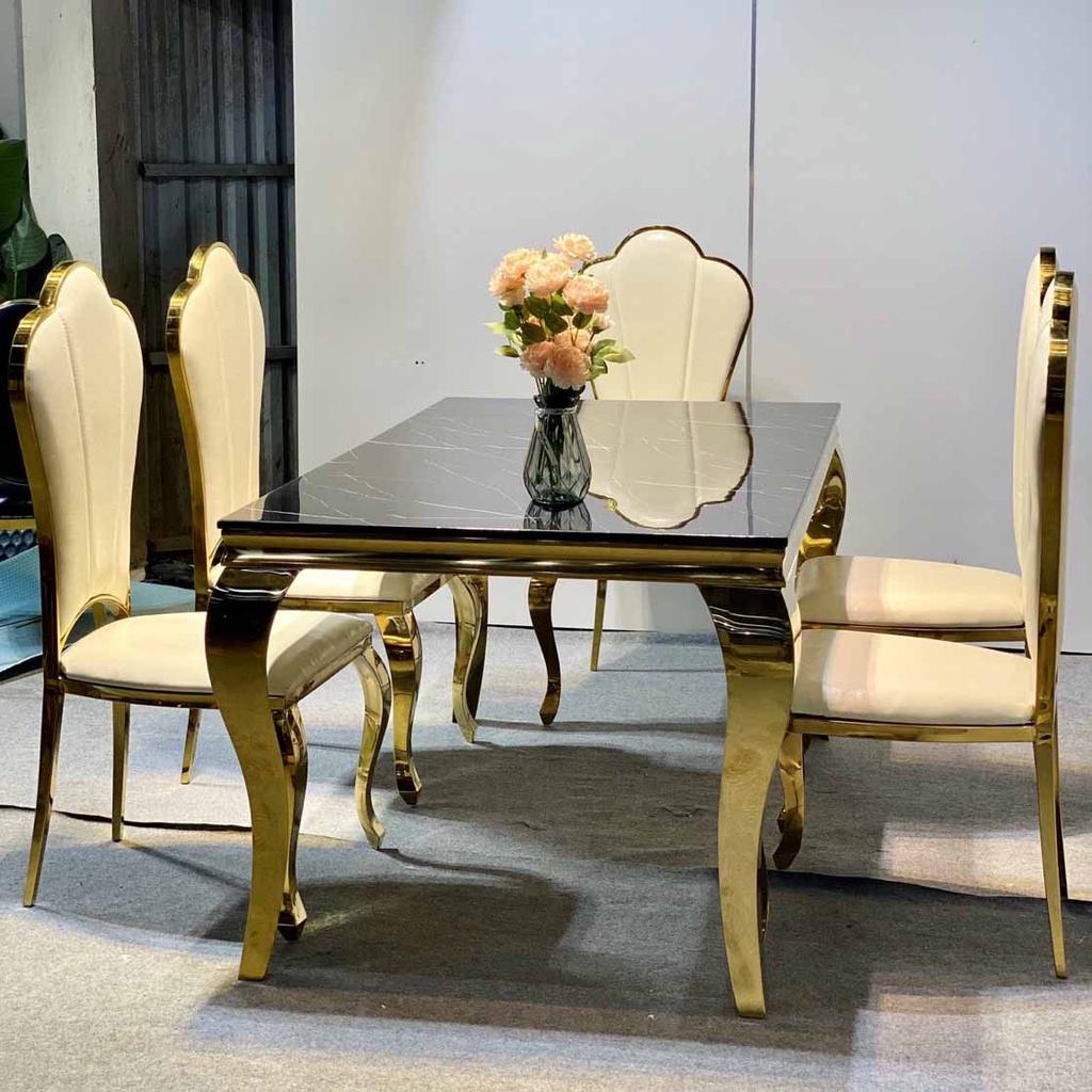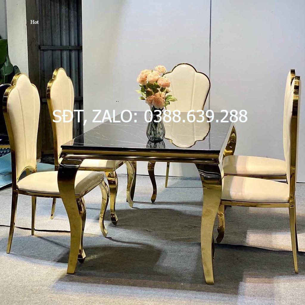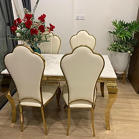 Bộ bàn ăn mặt đá nhập khẩu chân mạ vàng PVD ghế Queen - noithatgiakho.com