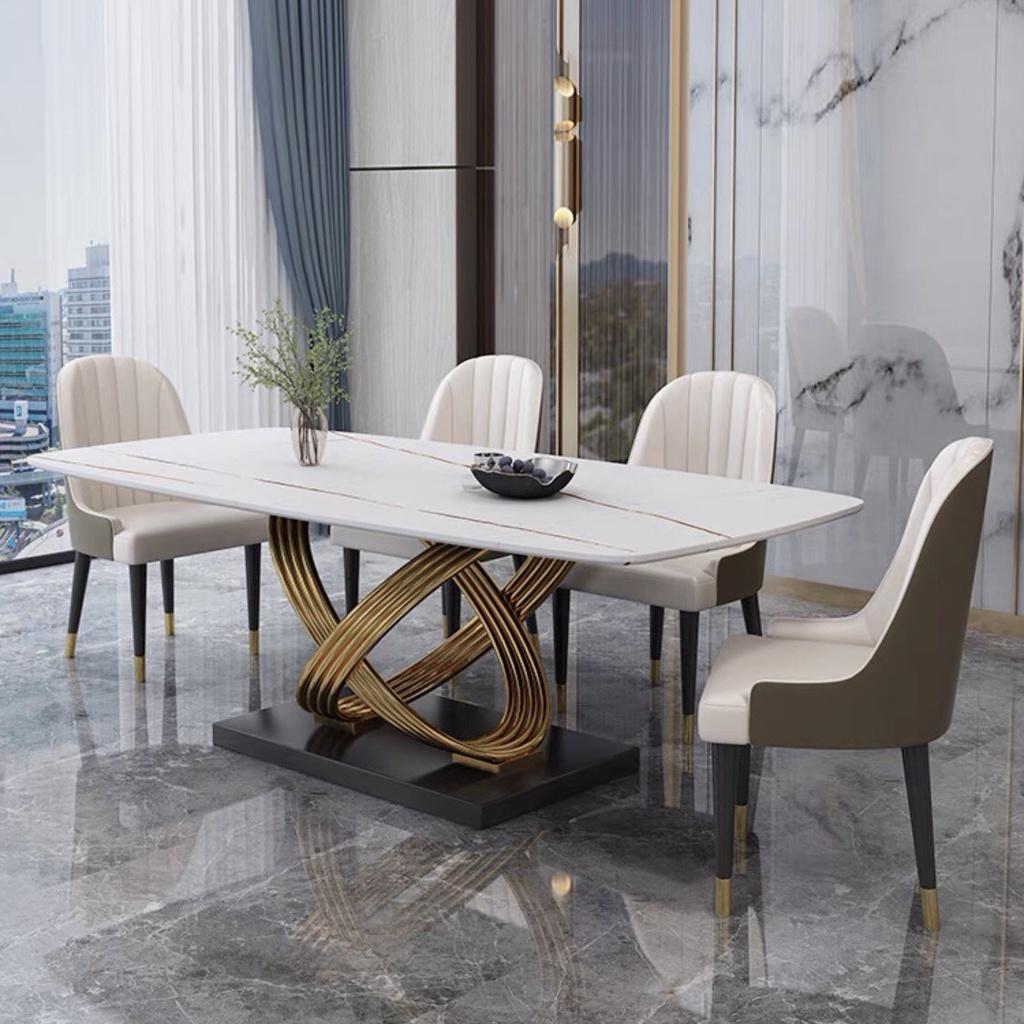 Bàn ăn mặt đá phiến Ceramic chân vòng viền da inox mạ vàng - noithatgiakho.com