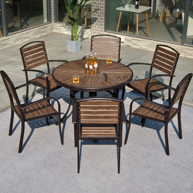 Bộ bàn ăn ngoài trời ghế khung nhôm nan gỗ nhựa composite và bàn mặt đá - Hàng nhập khẩu giá tốt
