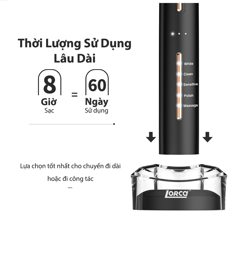 Sản phẩm còn trang bị pin lithium dung lượng lớn cho thời gian sử dụng lên đến 60 ngày chỉ sau 8 giờ sạc, kết hợp với chức năng cảm biến nâng cấp và tiêu chuẩn chống nước IPX7 đảm bảo sự an toàn và tiện lợi trong mọi điều kiện sử dụng. Với thiết kế sang trọng và màu đen tinh tế, Lorca TA-9208TB là lựa chọn hoàn hảo cho những ai tìm kiếm một chiếc bàn chải điện chất lượng cao, giúp chăm sóc sức khỏe răng miệng một cách toàn diện.