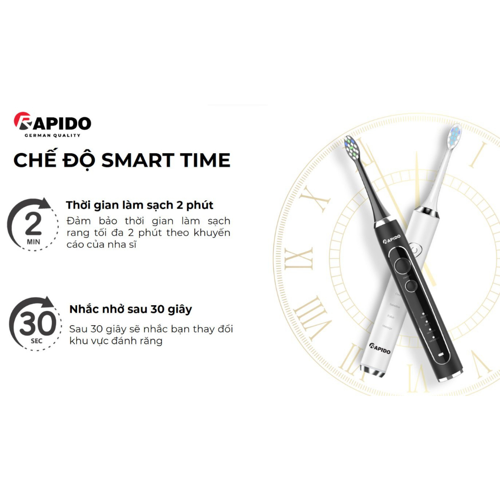 Cài đặt chế độ Smart time. Nhắc nhớ người dùng thay đổi vị trí làm sạch sau mỗi 30s. Và cài đặt theo chu trình làm sạch răng được nha sĩ khuyên dùng là 2 phút.