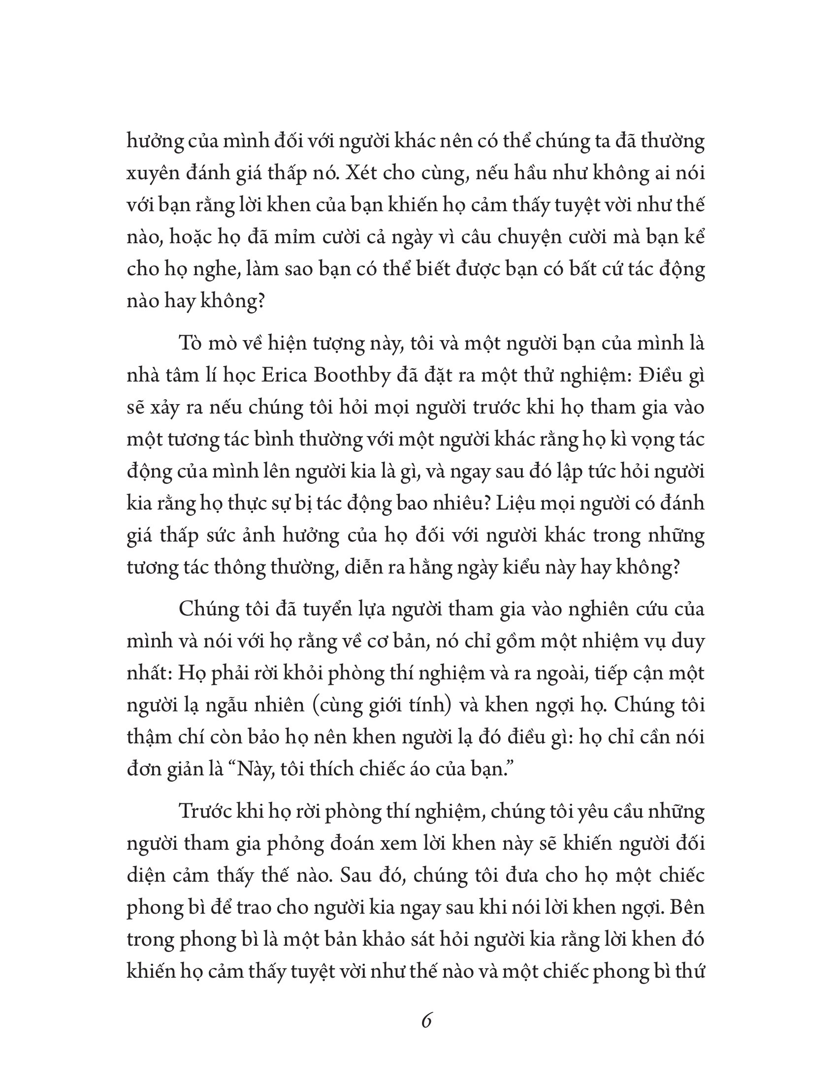 Chúng ta thường không khen người lạ hoặc bày tỏ lòng biết ơn đối với những người quan trọng trong cuộc sống của mình bởi chúng ta đánh giá thấp tác động từ lời nói của bản thân đến người khác: những người sẽ cảm thấy tuyệt vời biết bao khi nghe những điều tốt đẹp mà chúng ta nói.