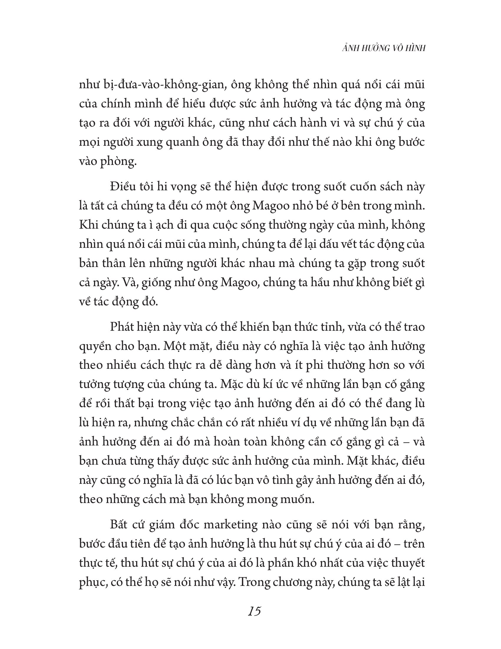 Không chỉ dành nhiều thời gian giảng dạy và nghiên cứu về hành vi xã hội, quan điểm và cảm xúc tự ý thức của con người, tác giả - Nhà Tâm lí học Xã hội kiêm Giáo sư về hành vi tổ chức tại Đại học Cornell, Vanessa Bohns đã giải thích lí do tại sao chúng ta không nhận ra sức ảnh hưởng mình có trong cuốn sách này. Đồng thời, bà cũng chỉ rõ ra rằng sự thiếu nhận thức về sức ảnh hưởng của bản thân có thể khiến chúng ta bỏ lỡ cơ hội, hay vô tình lạm dụng quyền lực của mình như thế nào.