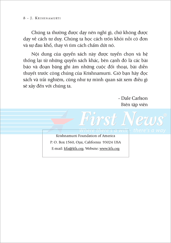 Mua tại TiktokBạn Đang Nghịch Gì Với Đời Mình Cách thức bạn và tôi liên hệ với bộ não, với mọi người, với tiền bạc, công việc, tình dục, … tất cả những mối quan hệ gần gũi này đều góp phần hình thành nên xã hội. Mối tương quan giữa chúng ta với chính mình, cũng như với hàng tỷ người khác tạo nên thế giới. Sự tập hợp những thiên kiến, nỗi cô đơn, những khát vọng tham lam, những cơn đói khát về thể xác hay về tinh thần, những nỗi giận và niềm đau trong mỗi chúng ta, tất cả cùng tạo dựng nên thế giới. Thế giới không cách biệt với chúng ta, thế giới chính là chúng ta. Nếu từng người trong chúng ta thay đổi thì cùng nhau, chúng ta thay đổi thế giới. Dù cho chỉ một người trong chúng ta thay đổi cũng đủ tạo nên gợn sóng lăn tăn, điều tốt đẹp vốn rất dễ lan truyền. Ở trường học, chúng ta được dạy rằng phải vâng lời cha mẹ và thầy cô, nghe thoáng qua điều này có vẻ hợp lý. Song, hàng ngàn thế hệ vẫn chưa hề học được, trên phương diện tâm lý, cách để chấm dứt đau khổ cho chính mình và ngừng gây đau khổ cho người khác. Quá trình phát triển tâm lý đã không bắt kịp quá trình tiến hóa sinh học hay phát triển khoa học. Ở trường, chúng ta đều học được cách kiếm sống; còn để lĩnh hội nghệ thuật sống thì chúng ta phải tự mình tìm hiểu lấy. Cuộc sống làm tổn thương tất cả chúng ta với sự cô đơn, bối rối, cảm giác thất bại, tuyệt vọng. Cuộc sống vùi dập chúng ta trong tình trạng nghèo đói, bệnh tật cảm xúc, bạo lực bủa vây từ trong nhà ra ngoài ngõ. Chúng ta được dạy dỗ nhiều điều, song rất ít trong số chúng có thể giúp được khi ta bị tổn thương, choáng ngợp trước cuộc sống. Một điều quan trọng mà chúng ta không được dạy, đó là không phải cuộc sống mà chính những phản ứng của ta trước những gì xảy ra mới là nguyên nhân dẫn đến đau khổ. Chính nỗi sợ bắt nguồn từ việc tự phòng vệ của ta đã khiến ta khổ sở. Bảo vệ cơ thể là phản xạ tự nhiên, nhưng liệu còn tự nhiên không khi ta bảo vệ cho cái tôi của mình, bảo vệ cho cái nguồn cơn gieo rắc rối, nỗi đau tâm lý mà chúng ta phải gánh chịu? Nếu bạn tìm cách trốn thoát khỏi nỗi đau tinh thần và sự rối loạn một cách hời hợt bằng việc sa đà vào matu.y và các thú tiêu khiển, tình d.ục, hoặc tìm cách khiến mình trở nên bận rộn, thì vấn đề vẫn còn nguyên, thêm vào đó là tình trạng kiệt sức và sự nghiện ngập. Hãy chú tâm đến những phương cách của cái tôi, và nhận thức rằng nỗi sợ hãi, ham muốn, hay cơn giận đều rất tự nhiên; bạn không nhất thiết phải thể hiện chúng ra ngoài hay phải có bằng được mọi thứ bạn muốn. Sự thấu thị này sẽ hóa giải nỗi thống khổ tinh thần, đồng thời tránh làm nó trở nên trầm trọng hơn. Chúng ta cần phải hiểu về bản ngã, nguồn cơn sinh ra những vấn đề của chúng ta; không phải theo kiểu chỉ biết mỗi mình, mà là để chú tâm vào những ý nghĩ, những cảm xúc và những hành vi của bản ngã, cùng với các khía cạnh sinh lý, cá nhân, giới tính và văn hóa của nó: đây chính là thiền định. Những mẩu hội thoại và những bài viết này được thực hiện bởi một người đàn ông sống theo cách của những người ngoài cuộc vĩ đại trong xã hội: kẻ nổi loạn, nhà thơ và nhà giáo lãng du, triết gia tôn giáo, người bài trừ thần tượng, nhà khoa học và nhà tâm lý học đột phá. Krishnamurti đã dành ra hơn 65 năm để diễn thuyết về tự do tâm lý cho bất kỳ ai muốn lắng nghe thông điệp của ông. Ông đã sáng lập các trường học dành cho trẻ em và thanh thiếu niên, nơi mà thiếu nhi và giới trẻ có thể học hỏi về mọi chủ đề, môn học thường thức cũng như về chính bản thân họ. Trong các bài giảng trên lớp và trong tất cả các bài nói chuyện, bài viết của mình, ông chỉ ra rằng không phải những cuộc đấu tranh nội tâm cũng như cuộc chiến bên ngoài sẽ giải phóng chúng ta, mà chính sự thật về bản thân chúng ta sẽ làm điều đó. Không tồn tại bất cứ lộ trình, uy quyền hay bậc thầy nào đưa đường dẫn lối: Bạn có khả năng nội tại để khám phá xem mình là ai, đang làm chi với đời mình và nhìn nhận các mối quan hệ, cùng công việc của bạn. Bạn phải thử trải nghiệm những điều được đề cập trong quyển sách này. Sự thật do một người khác chỉ ra cũng không khác gì một ý kiến, cho đến khi bạn tự mình trải nghiệm. Bạn phải soi rọi mình thật rõ ràng, hoặc bạn sẽ mắc kẹt với một đám bụi mịt mù của ngôn từ mà không thực sự nhận biết gì về cuộc sống. Chúng ta thường được dạy nên nghĩ gì, chứ không được dạy về cách tư duy. Chúng ta học cách trốn khỏi nỗi cô đơn và sự đau khổ, thay vì tìm cách chấm dứt nó. Nội dung của quyển sách này được tuyển chọn và hệ thống lại từ những quyển sách khác, bên cạnh đó là các bài báo và đoạn băng ghi âm những cuộc đối t