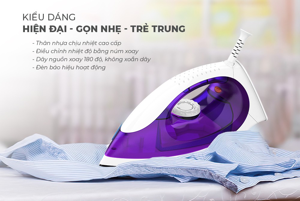 - Thiết kế gọn nhẹ dễ sử dụng, màu sắc trẻ trung bắt mắt. - Tay cầm thiết kế vừa vặn, chắc chắn không gây mỏi khi ủi nhiều đồ. - Mũi bàn ủi thiết