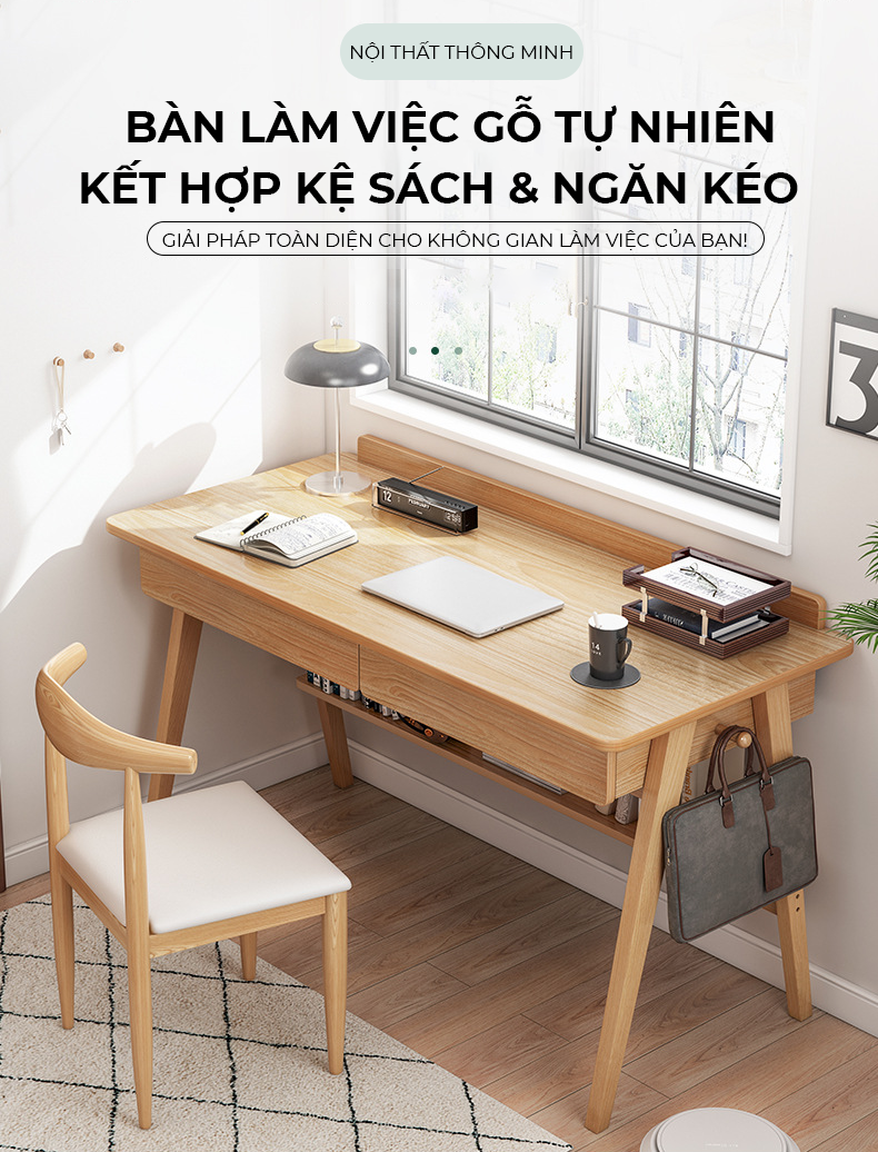 - Tên sản phẩm: Bàn làm việc kèm ngăn kéo và kệ để đồ - Chất liệu: Gỗ MDF phủ melamine cao cấp chống xước - chân bàn gỗ tự nhiên - Màu sắc: Vân gỗ sồi - Kích thước: 80/120 x 55 x 82cm (dài x rộng x cao) - Công năng: Là mẫu bàn làm việc, bàn học giúp tiết kiệm diện tích không gian phòng