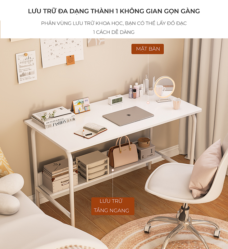 Công năng: Là mẫu bàn làm việc thiết kế thông minh kèm kệ sách theo phong cách minimalism trẻ trung dễ thương.