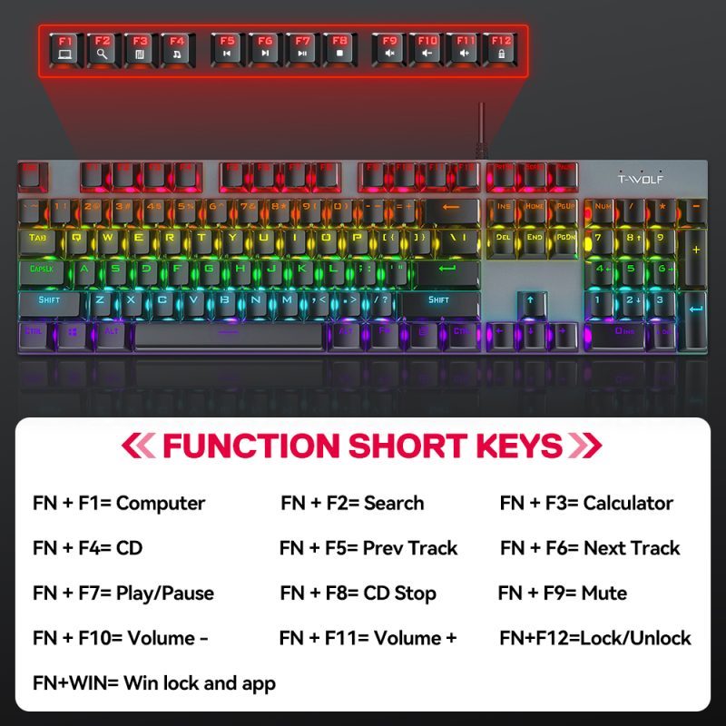 Mô tả sản phẩm Bàn Phím cơ T-Wolf T17, Blue Switch, USB, LED, 104 Gaming T-Wolf T17 Blue Switch là lựa chọn hoàn hảo cho những ai đang tìm kiếm một bàn phím cơ giá