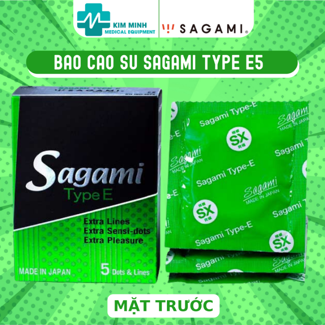 - An toàn: Sản phẩm được sản xuất theo dây truyền hiện đại, đáp ứng các tiêu chuẩn thế giới, cung cấp cho các thị trường khó tính nhất như Mỹ, EU …. Mang đến sự an toàn, tin tưởng cho người sử dụng. Ngoài ra 100% các sản phẩm bao cao su Sagami Type E đều được sản xuất và nhập khẩu trực tiếp từ Nhật Bản.