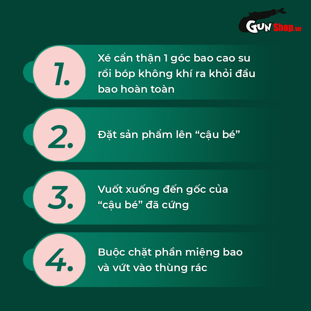 ✪ Cách dùng: Cẩn thận xé 1 góc bao cao su rồi bóp không khí ra khỏi đầu bao, sau đó đặt bao vào đầu rồi vuốt xuống đến gốc. Sau khi quan hệ xong giữ đầu bao rồi từ từ rút ra tránh làm tràn tinh dịch. Thắt miệng bao rồi vứt vào thùng rác.