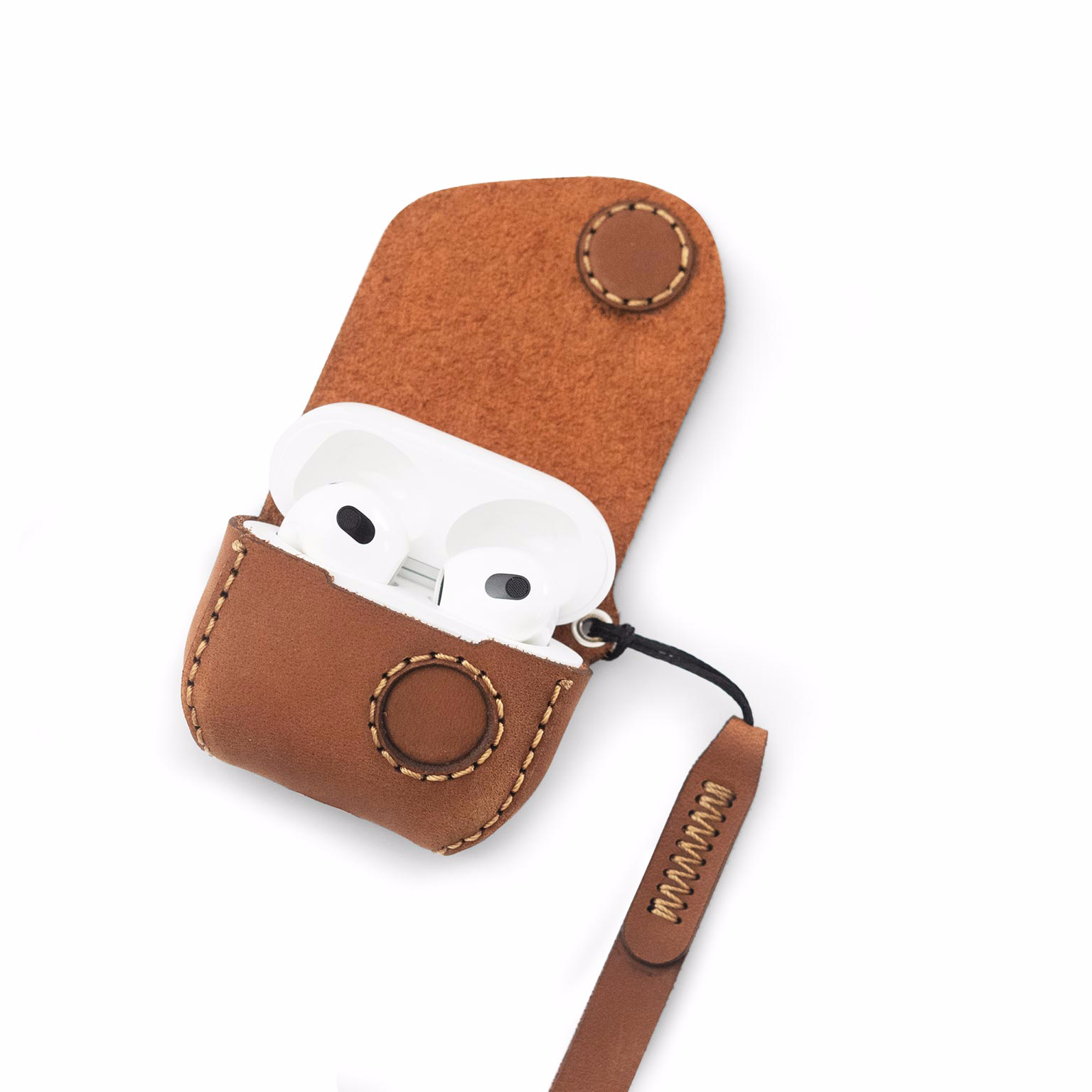 Sản phẩm gồm bao da Apple Airpods Pro 3 và dây đeo tay. Thiết kế tối giản với đường cắt góc botròn mềm mại ôm sát sản phẩm. Lớp da bò thô bên trong giúp